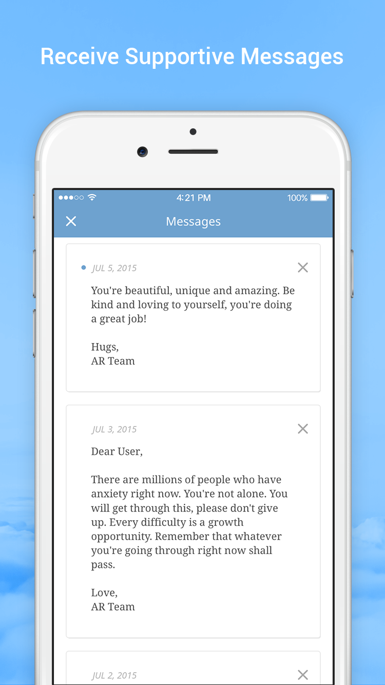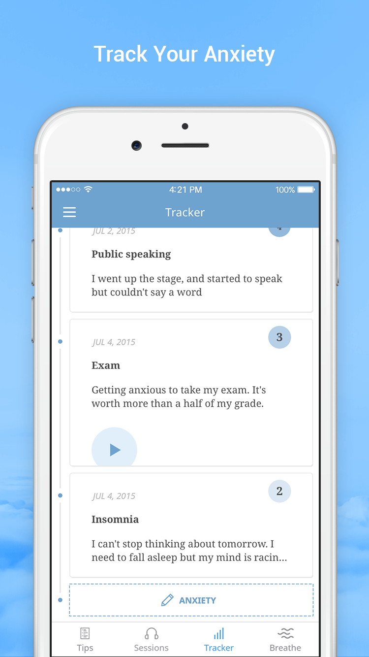 Relax, overcome anxiety and stress and fall asleep faster with the help of Anxiety Reliever. Immerse yourself in a relaxing, supportive and soothing environment. Anxiety Reliever consists of a Collection of Calming Audio Recordings, Helpful Guides, Insightful Anxiety Tracker, Breathe and Supportive Messages. Download it for free on the App Store and Google Play. App Store: https://itunes.apple.com/us/app/anxiety-reliever-helps-to/id1029839288?mt=8 Google Play: https://play.google.com/store/apps/details?id=com.anxiety_reliever&hl=en