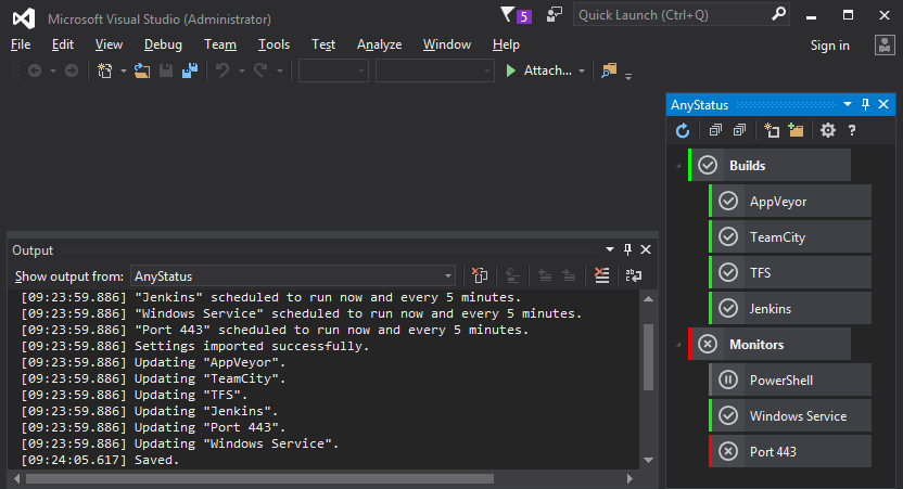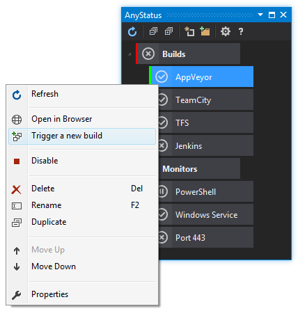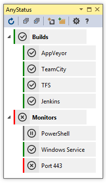 AnyStatus is a monitoring extension for Microsoft Visual Studio which monitors software CI builds, Code Coverage, Online Services, HTTP servers, TCP/UDP connections, Ping requests, Windows services, performance counters, GitHub issues...and much more. It is also capable of showing Metrics, for example the CPU usage of a remote computer, or the number of open bugs, or even the weather in your area.