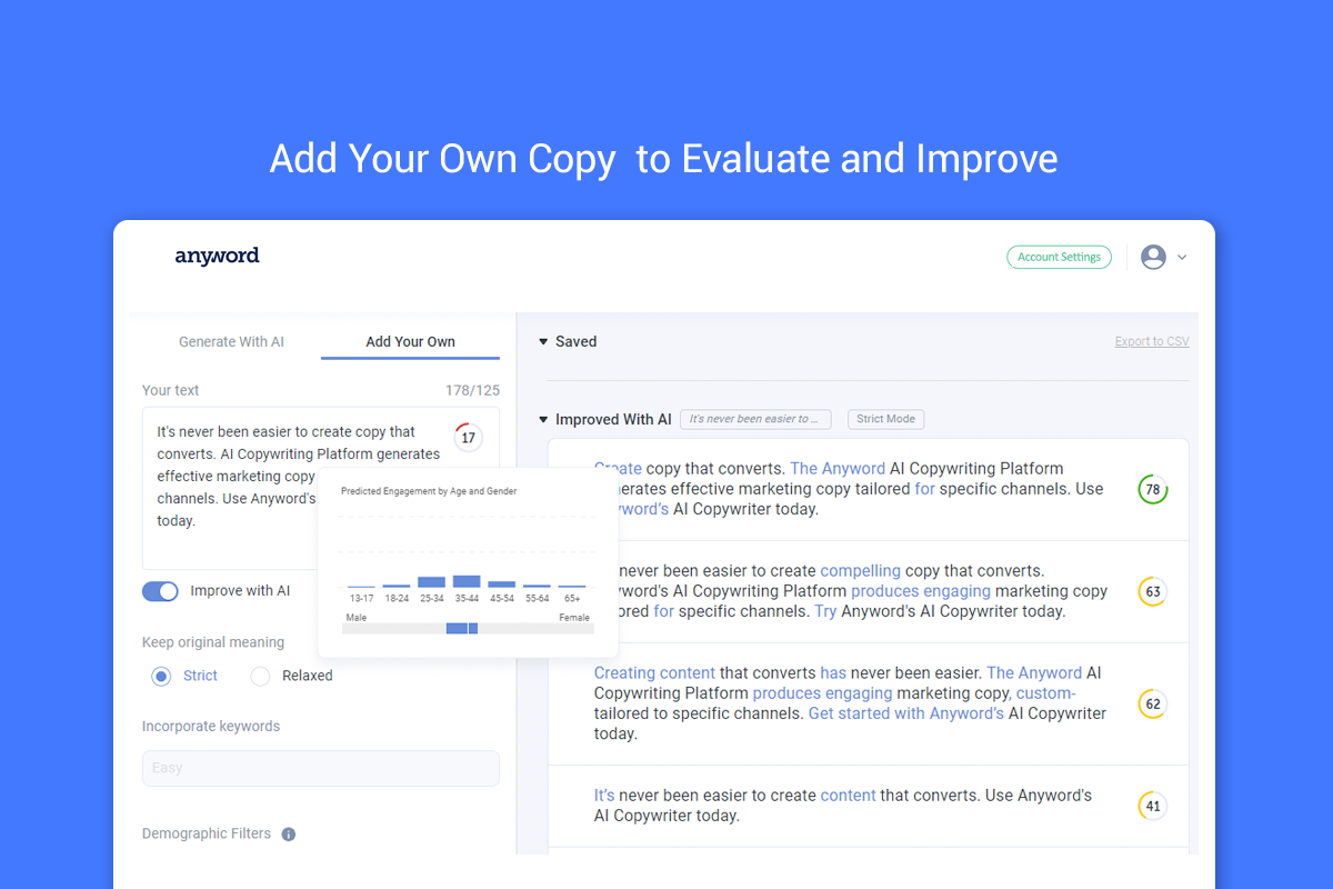 Anyword is a platform where marketers can generate and optimize their marketing copy with the help of AI. You can generate ad copy for Facebook, Google, Instagram, Native, Twitter, LinkedIn, and more. Improve your landing page headline, CTAs, and product descriptions. Generate email subject lines that will make your open rates skyrocket. Generate blog post outlines, titles, and paragraphs that are made to engage. Trained on over $250M worth of ad spend, Anyword knows what works and converts. Every variation is given a Performance Prediction Score, which can forecast how well it will do. In field tests the score has been proven to be right 76% of the time, so you can confidently choose the top performers that suit you, saving countless hours and endless budgets on A/B testing. Anyword also offers more advanced features including dynamic landing page text optimization, connection to your ad accounts to ensure your brand voice is consistent, and other advanced options.