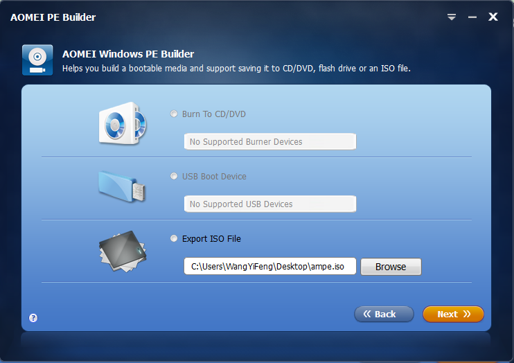 AOMEI PE Builder is a free assistant to AOMEI Backupper or AOMEI Partition Assistant, and a freeware to create a bootable environment into CD/DVD, USB flash drive or ISO file based on Windows PE (Windows Pre-installation Environment) without installing AIK/WAIK, which integrates a set of tools that enables you to boot up your computer for easy maintenance and fast recovery tasks when the native system is corrupted or cannot be used. Learn More