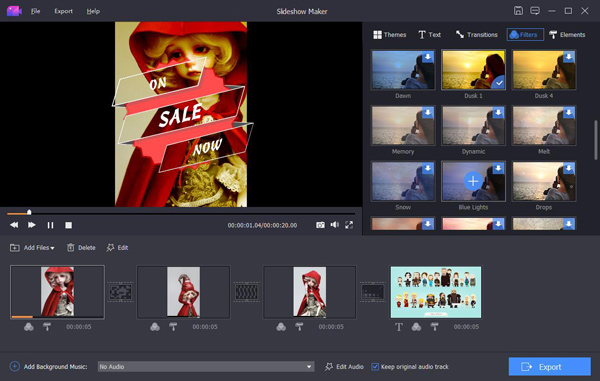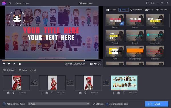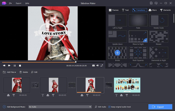 If you want to change your videos, photos and audio files into slideshow, absolutely, Apeaksoft Slideshow Maker is your best choice. With it, you can load your files from videos (MP4, MOV, AVI, FLV, WMV, MTS, M2TS, TS, M4V, RMVB, ASF, VOB, etc.), photos (JPG, JPEG, PNG, TIF, TIFF, BMP, GIF, etc.), and audio (MP3, AIFF, FLAC, AAC, WAV, WMA, M4A, etc.) and make your own slideshow videos without any hassle. Key functions: 1. Make slideshow easily With Apeaksoft Slideshow Maker, you only need to load your own videos, photos, audio files, and you could also add the background music if you want. Then click the Export button, you will get your wonderful slideshow videos. 2. Support all kinds of media formats Apeaksoft Slideshow Maker supports various video formats, such as M4V, RMVB, ASF, VOB, DAT, 3GP, MOD, TOD, WebM, etc. For the photo formats, it supports JPG, JPEG, PNG, TIF, TIFF, BMP, GIF, etc. It also supports various audio formats, such as FLAC, AAC, WAV, WMA, M4A, OGG and so on. 3. Provide various themes All kinds of slideshow themes such as Romantic, Fashion, Business, etc. are provided to create slideshow. You can choose the theme according to your demand. Besides the built-in slideshow themes, Apeaksoft Slideshow Maker has many text effects, transitions modes, filters and other elements to help you customize existing themes or make new themes. 4. Powerful editing functions Apeaksoft Slideshow Maker also helps you to edit your videos and you can rotate/crop/clip videos, adjust contrast/saturation/hue/brightness, speed up or slow down videos, adjust audio volume, etc.