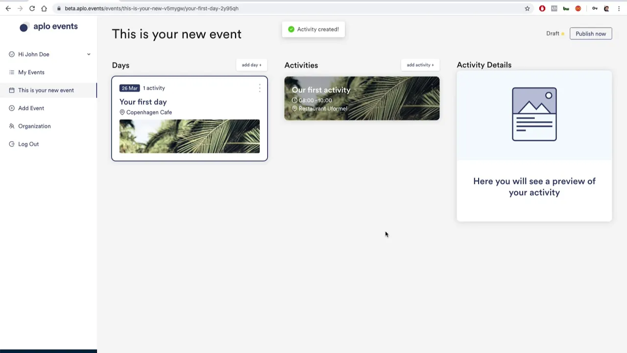 DESCRIPTION This is Aplo Events, a smarter way to engage. Minimalistic // We believe in beautiful design, and value simplicity. Simplicity // We've not packed it with a 1000+ features that will only confuse more than do good. Easy to use // We've built it for people who don’t have a lot of time, for this reason creating an event is easy and fast. “I really liked the intuitive interface! I will definitely use Aplo Events the next time I am organizing an event.“ - Aplo Events Early Access user “The notifications saved me from a lot of stressful calls and text messages to my colleagues on our annual team trip! Thanks guys!” - Aplo Events Early Access user INTRODUCING Aplo Events is an easier and smarter way of planning and communicating your events. Whenever you make a change to your published event, the participants will receive a notification updating them of the schedule, and of any relevant details. Whether you need to set up a conference, arrange a festival, or just go on a trip with your friends, our tool will help you simplify the whole event and display it in the best way possible. The mobile app is currently only for participants but soon users can create events directly in the app too! HOW TO USE 1. Go to our website at aplo.events and sign up 2. Create your first event. 3. Publish the event and share the invitation code with your participants 4. Download the Aplo Events app and enter the invitation code 5. Enjoy the event!