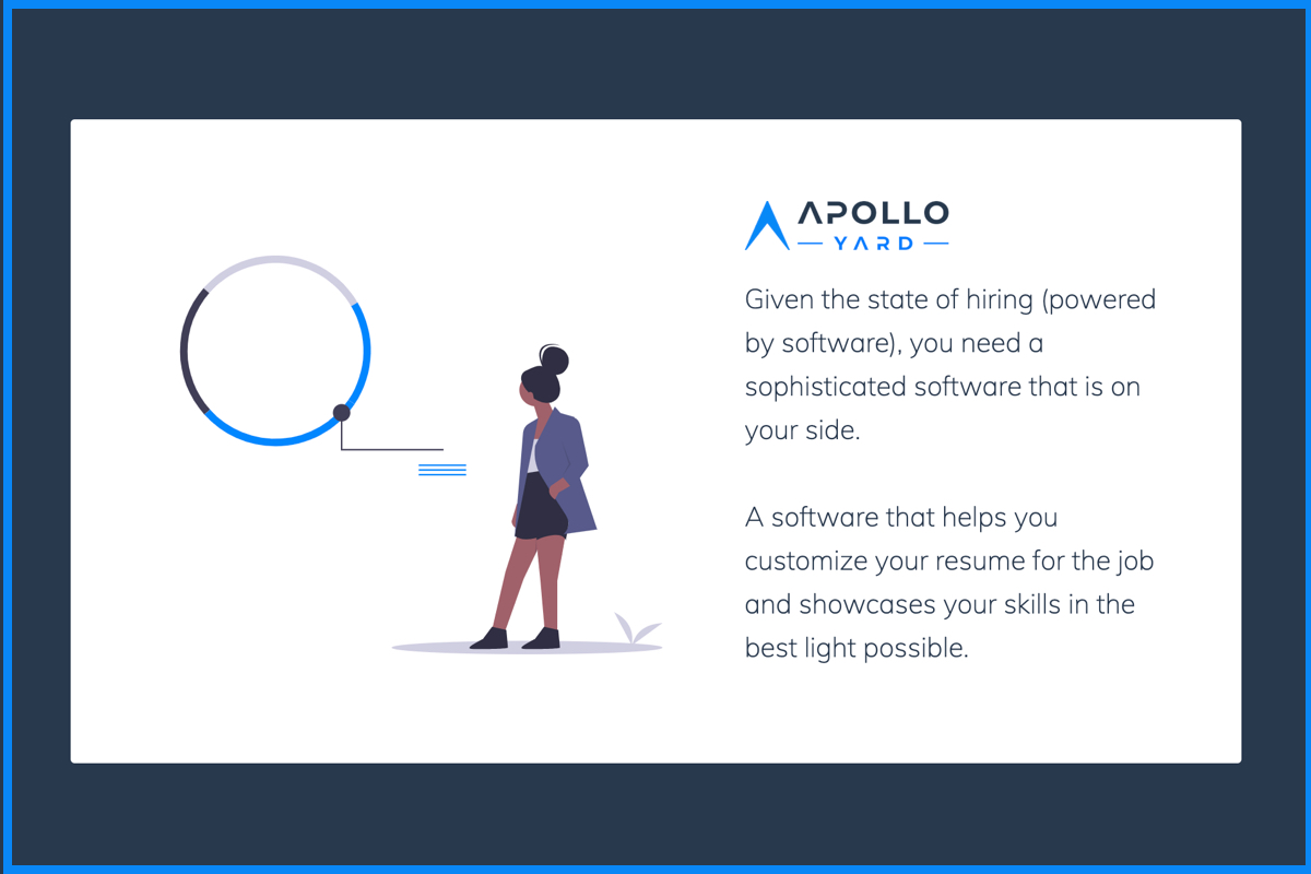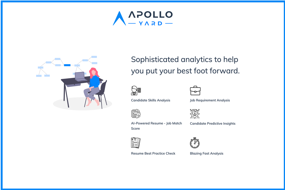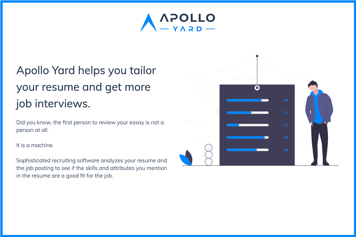 Apollo Yard helps job applicants tailor their resume and get more job interviews. Did you know, the first person to review an applicant's resume is not a person at all. It is a machine. Sophisticated recruiting software analyze resumes and the job postings to see if the skills and attributes mentioned in the resume are a good fit for the job. At Apollo Yard, we use the same sophisticated technology to provide job applicants with targeted suggestions to improve their resume and score more job interviews. With Apollo Yard, job applicants instantly get suggestions to improve their resume. They don't need to wait for days or even hours. And the best part is the software is completely free for job applicants.