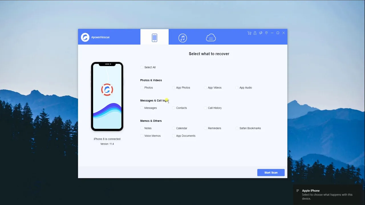 1. Recover deleted data from iPhone and iPad. 2. Retrieve lost files by scanning or iTunes/iCould backup. 3. Recovery category: Contacts, Messages, Calendar, Notes, Reminders, Call History, Safari Bookmarks, Voice Memos, Photos, App Photos, App Videos, App Audio, App Documents.