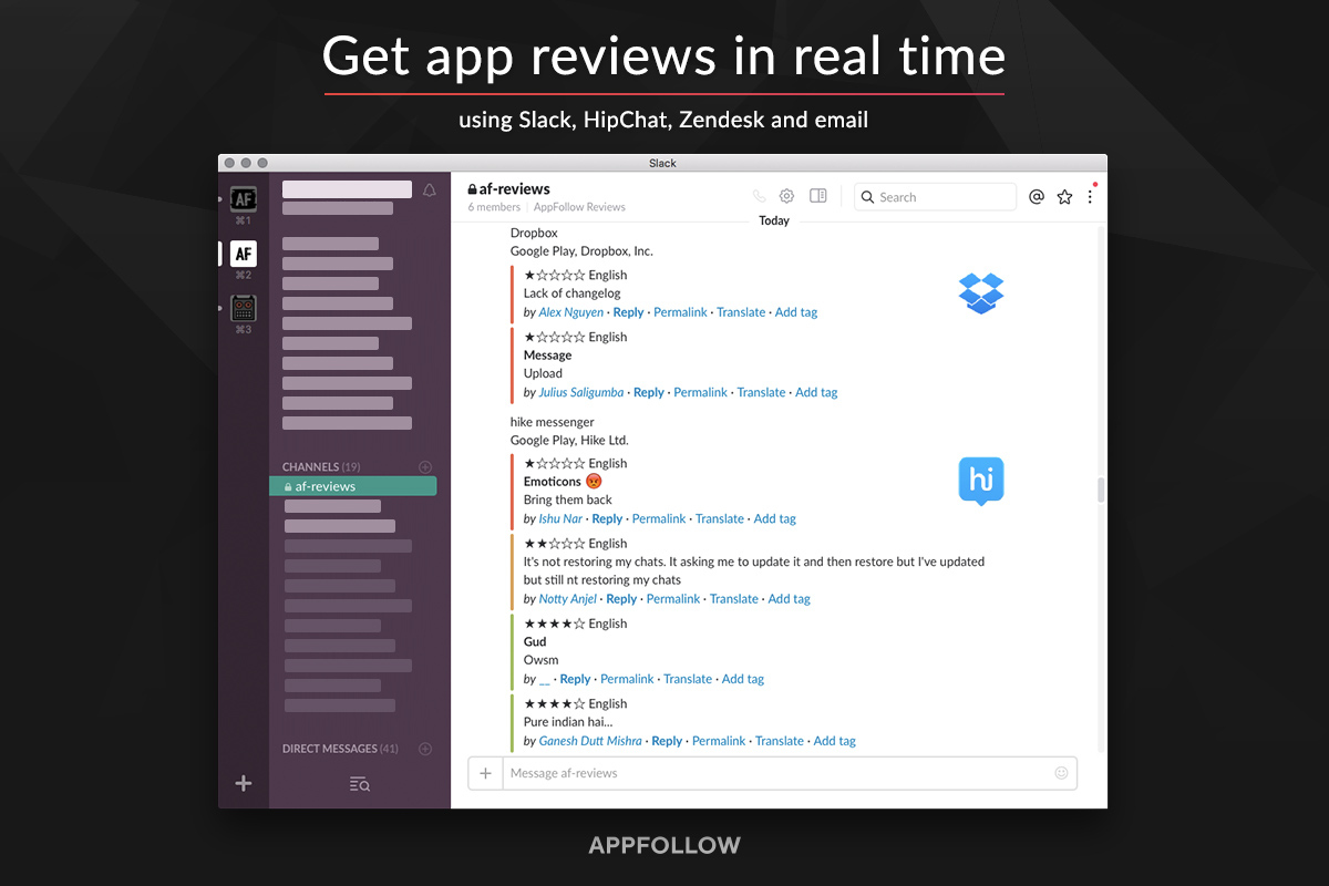 Track app activities in real-time for App Store, Google Play and Windows Store. Powerful integrations with Slack, HipChat, Zendesk, Trello, email.