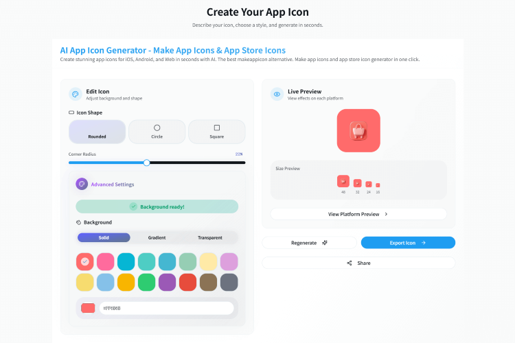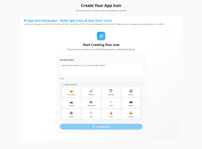 **Create Unique App Icons with Just a Text Prompt** AppIconKitchen is an AI-powered icon generator that turns your ideas into professional app icons. Simply describe what you want – "rocket ship in clay 3D style", "chat bubble in flat design", "pixel art sword" – and watch AI bring your vision to life. **Why AppIconKitchen?** Traditional icon generators give you limited templates and clipart. AppIconKitchen uses AI to understand your description and create truly unique icons that match your vision. No design skills required – just describe it, and AI creates it. **How It Works** 1. **Describe your icon** – Type what you want in your own words: "minimalist camera in blue", "cute monster in pixel art", "professional shield logo" 2. **Choose your style** – Select from 4 distinctive styles: 3D Clay (playful & modern), Flat (clean & minimal), Mac Style (sleek & professional), or Pixel Art (retro & nostalgic) 3. **Customize & refine** – Customize backgrounds, adjust colors, tweak gradients until it's perfect 4. **Export everything** – One click gets you ALL assets for iOS, Android, and Web **Platform-Ready Assets** With a single click, export a complete asset package: **iOS Assets:** Full AppIcon.appiconset with Contents.json – every size from iPhone (60pt@2x, @3x) to iPad (76pt, 83.5pt) to App Store (1024x1024). Just drag into Xcode. **Android Assets:** Complete mipmap structure (mdpi through xxxhdpi) with Adaptive Icon support. Includes separated foreground/background layers for Android 8.0+ launchers. Play Store 512x512 included. **Web & PWA Assets:** favicon.ico, apple-touch-icon.png, PWA icons (192px, 512px), and manifest.json – everything your website needs. **Built for Developers** AppIconKitchen understands platform requirements. No alpha channel issues, no size mismatches, no rejected submissions. Every asset meets Apple and Google guidelines. **Try it now** – Describe your ideal icon and get professional assets in seconds.