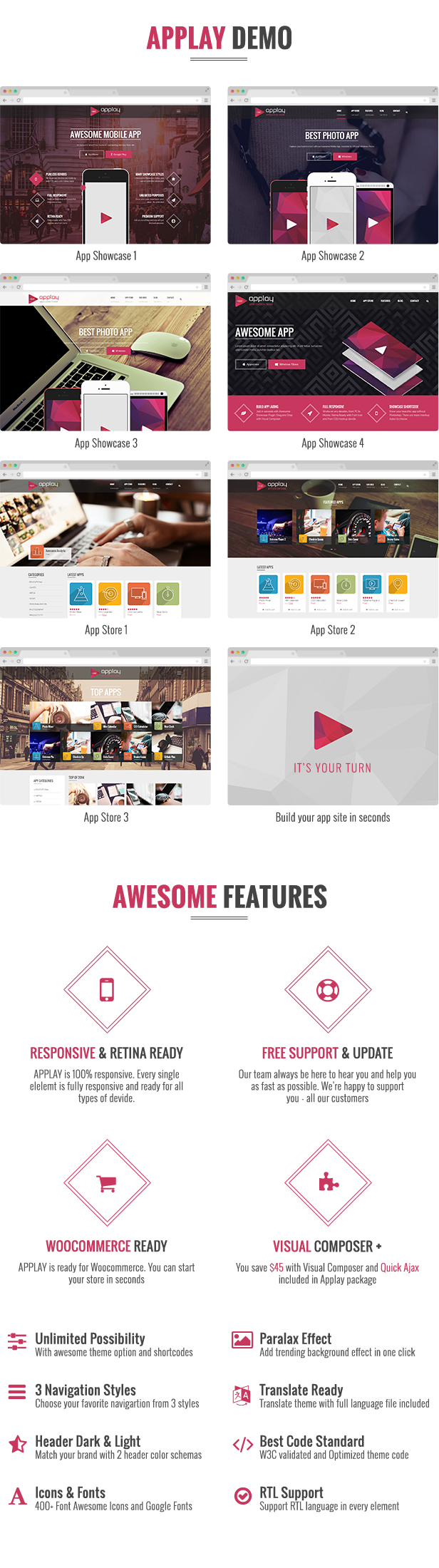 APPLAY – Best App Showcase & App Store Theme DEMO: http://demo.leafcolor.com/applay/ Applay is a multipurpose WordPress theme for App showcase, Appstore, App Landing, Business and Shopping. Applay comes with Drag & Drop Builder, Exclusive Interactive Mobile Mockup plugin, Unlimited Colors & Layout… FULL FEATURE LIST Auto Fetch App info from Apple iTunes & Google Play (title/description/screenshots/icon…) (New in 2.0) Support External Screenshot Image Urls (New in 2.0) Easy Easy and Easy Build with Friendly Theme Options Quick Quick and Quick Setup with Demo Data included User Submit App Form with Auto Fetch and Email notification Ultra Responsive Design (Build with Bootstrap) Retina Ready 4 Homepage variations and Unlimited Possibilities 3 Appstore variations and Unlimited Possibilities 3 Header Styles x 2 Header Schemas (Dark/Light) 2 Theme Styles (Modern/Classic) Mobile Showcase Builder Plugin – create mobile mockup without Photoshop Parallax & CSS Animation Effect ONE PAGE optio