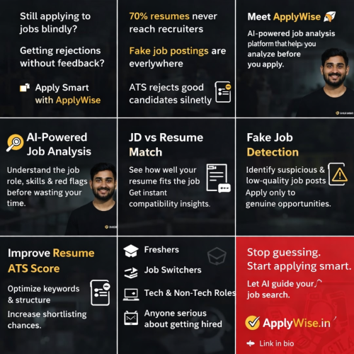 ApplyWise is an AI-driven job analysis and resume intelligence platform that helps job seekers apply smarter and get hired faster. Many candidates face repeated rejections due to ATS filters, fake job postings, or poor resume-job alignment. ApplyWise solves this by allowing users to analyze job descriptions before applying. The platform compares job descriptions with resumes, highlights skill gaps, detects suspicious or fake job listings, and provides actionable insights to improve resume ATS scores. It is built especially for freshers, job switchers, and candidates applying to both tech and non-tech roles. ApplyWise empowers users to stop guessing and start applying strategically by using AI-powered insights. The goal is to reduce wasted applications, increase interview calls, and create a safer, smarter job search experience—all from a single platform