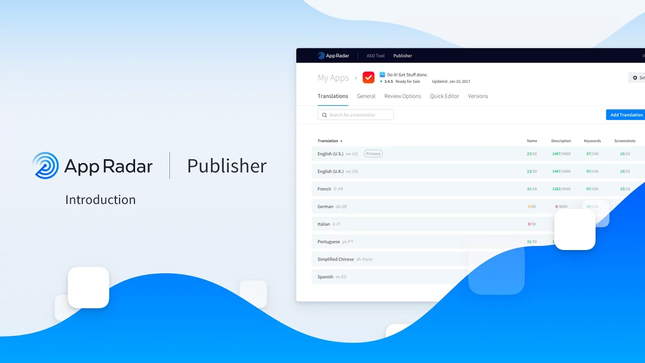 App Radar is an online tool that helps app developers understand and optimize their app store appearance. It comes with useful keyword tracking & research functionality and is the first tool that lets them publish and manage app store listings for both Google Play & Apple App Store in one place. It lets app owners use the full potential of their app to get it to more users. App Radar is thrilled to offer an all-in-one app store marketing solution to take app store optimization to the next level. The tool, therefore, consists out of two modules, each concentrating on app publishing and keyword tracking functionality. App Radar ASO Tool gives daily information about app store rankings based on your keyword set. It helps app developers understand if and how their app can be found at the app stores. It furthermore sends you daily or weekly keyword ranking reports via Slack and/or email to easier your work.