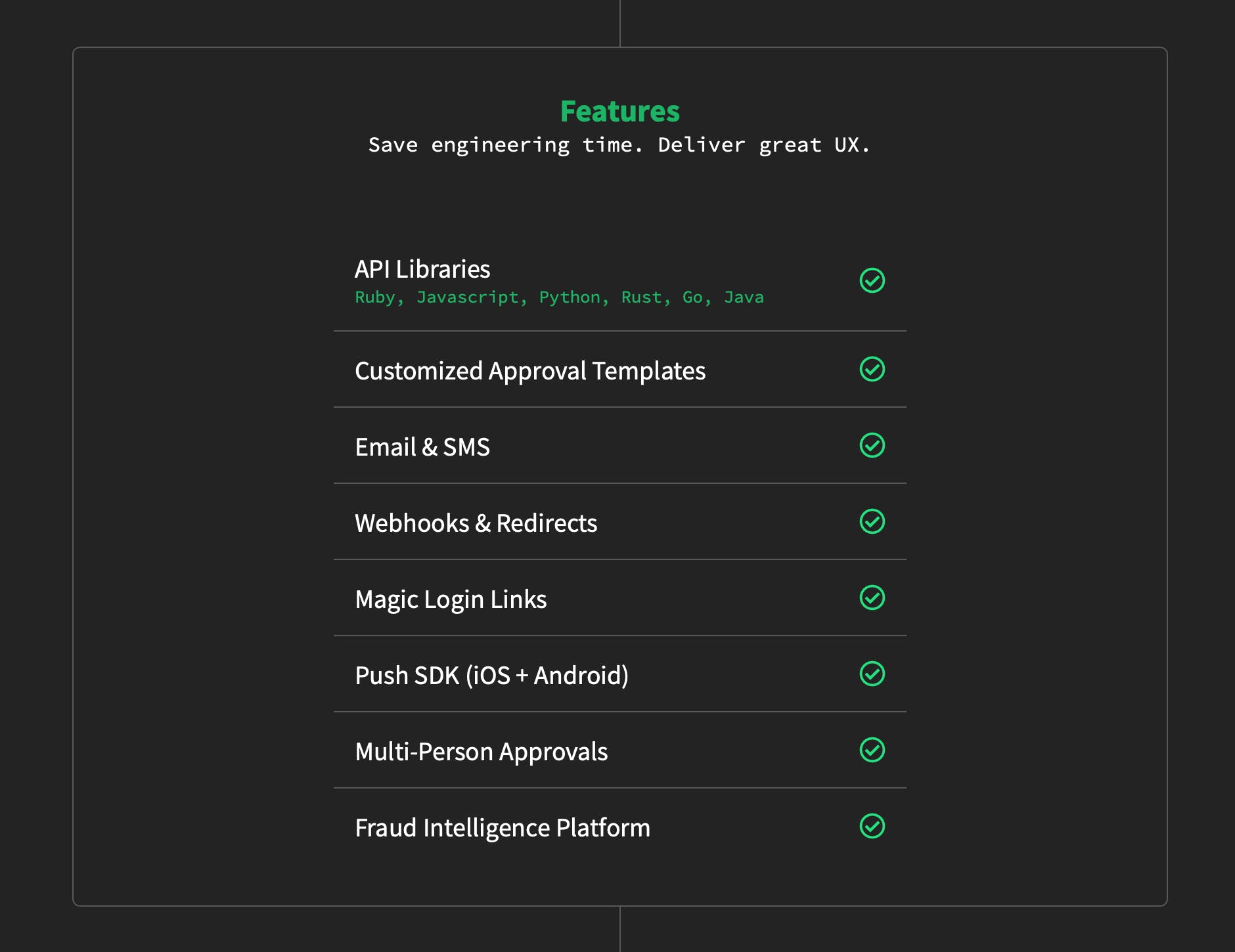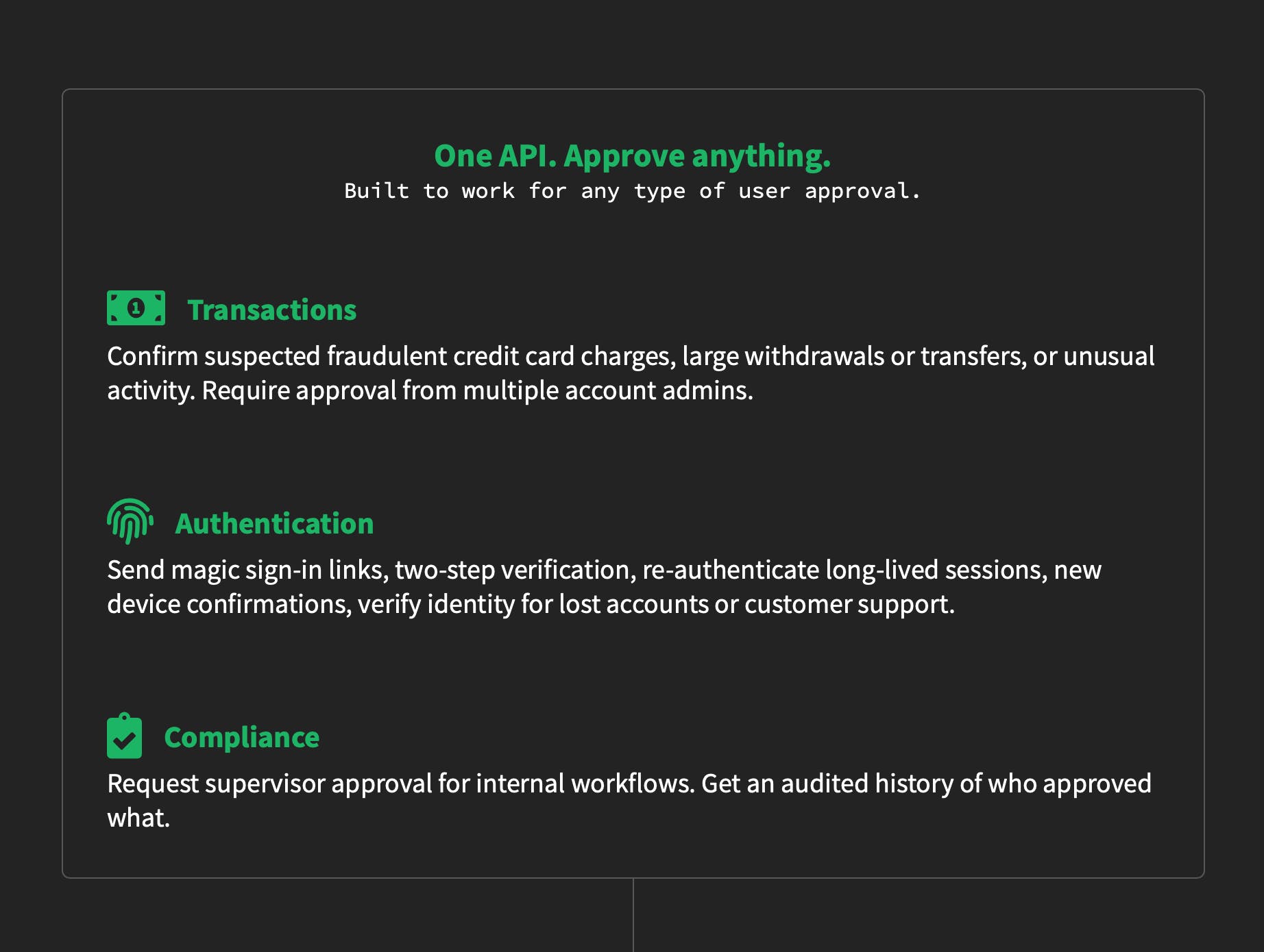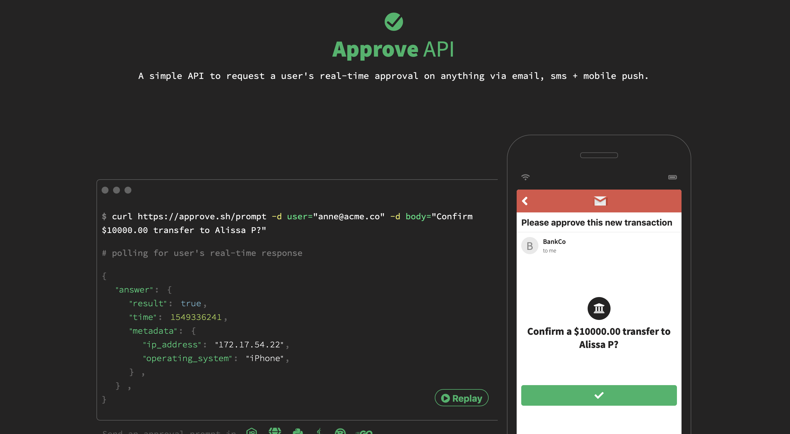 We built ApproveAPI to make it easy for developers to request real-time user approvals and secondary verifications for any workflow on any device (email, SMS, or even an in-app push inside your own app). There are so many workflows that need approvals -- from confirming suspected fraudulent transactions, authenticating users with two-factor verification, verifying identity for customer support, to internal compliance use cases with supervisor approvals and audit logging. We set out to build a secure verification solution which gives users context about what they’re approving with an elegant tap-to-approve experience. We can’t wait to see what you build with it!
