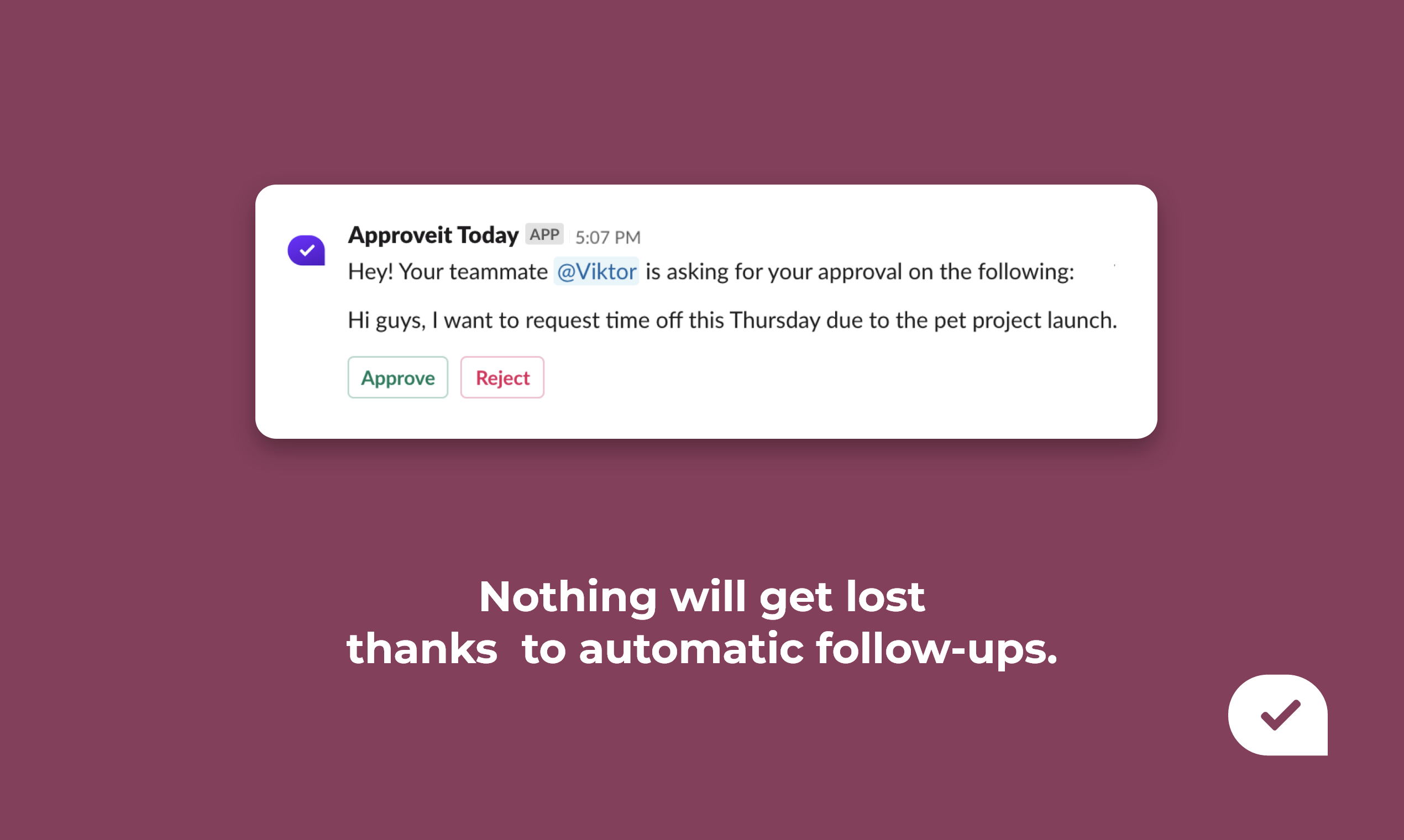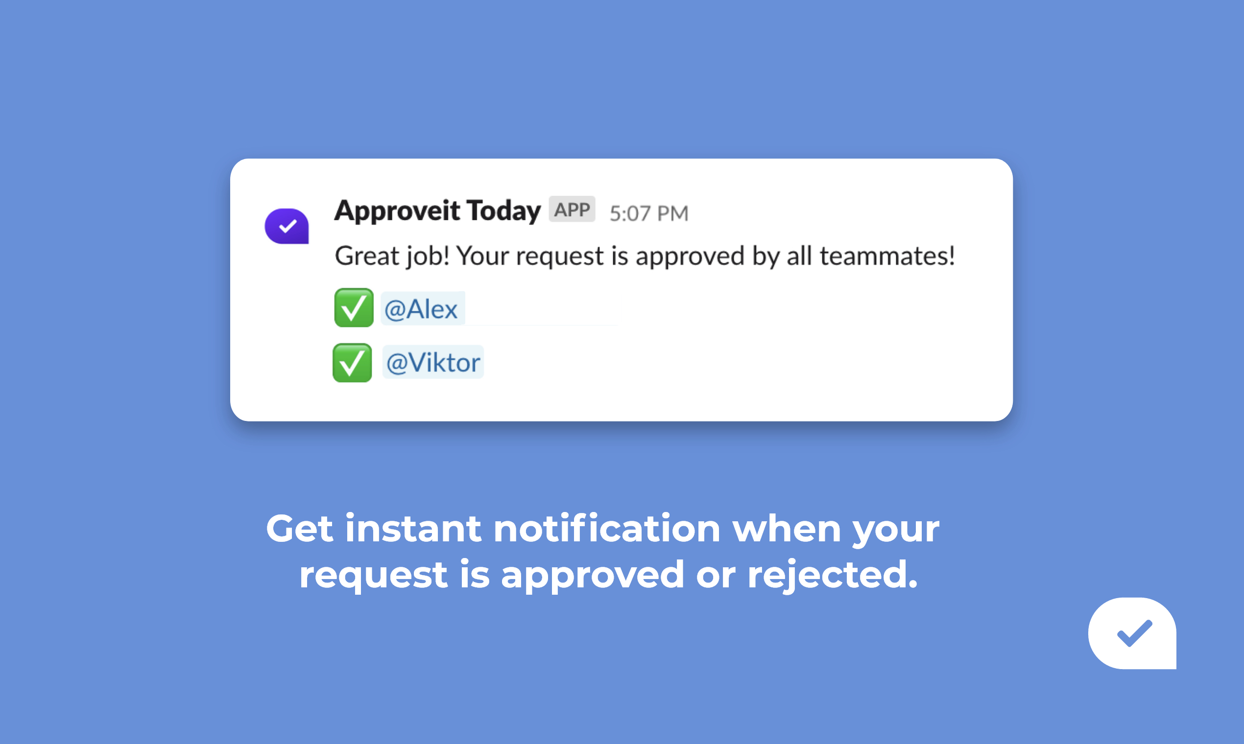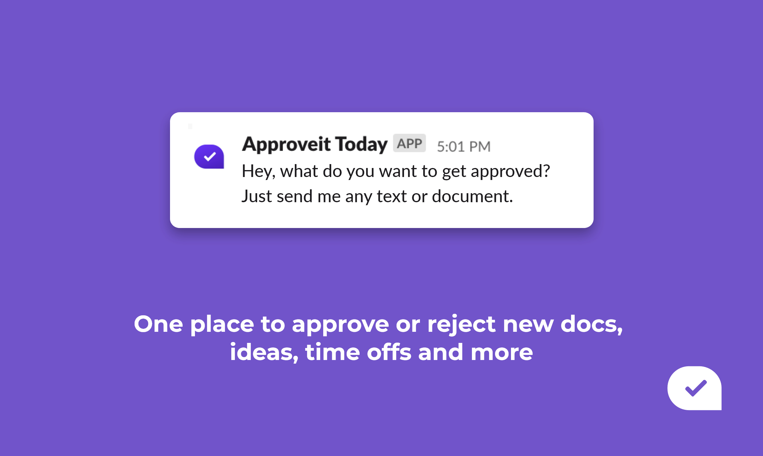 Approveit Today is the App for Slack for faster and more convenient Approval workflows. Cut the waiting time and eliminate lost approval requests: ? Ask specified teammates to approve quotes, docs, time-off requests, expenses, and more ? Automatic follow-ups ? Instant notifications on the approvals or rejections with comments ? Requests log