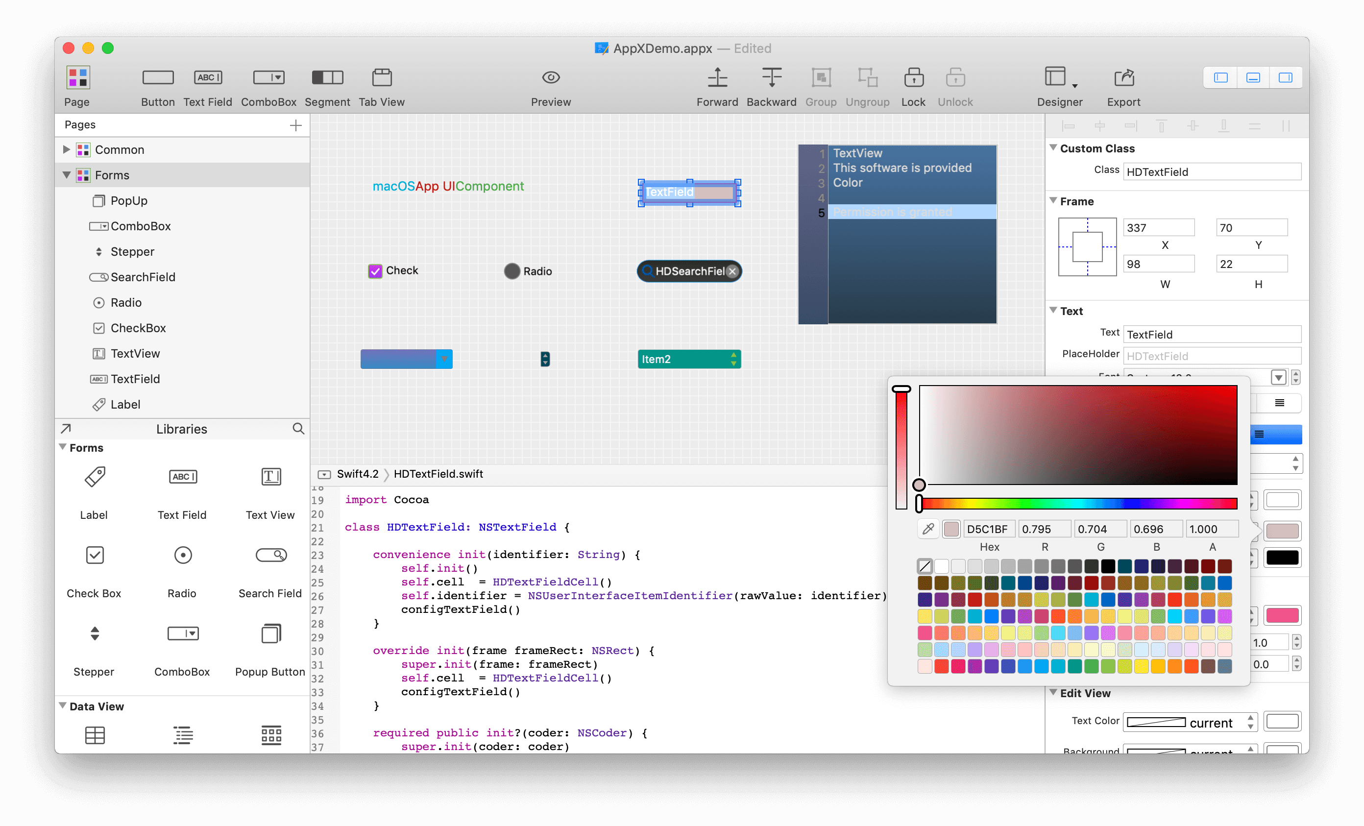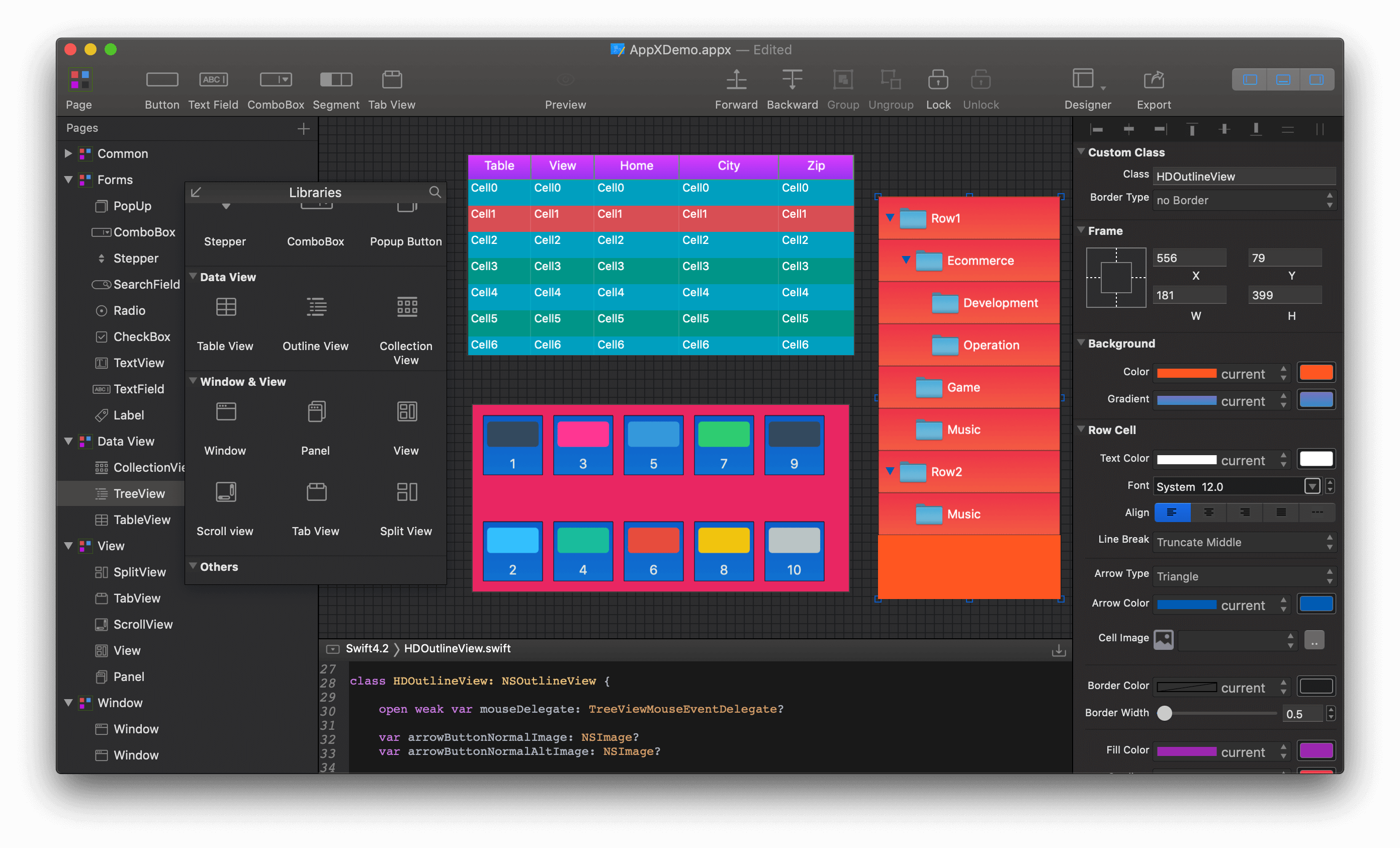 With powerful and intuitive editing feature, AppX lets you create custom components to build a genius macOS App never before. quickly drag and drop a component from the Libraries to the design panel, customize its background color, foreground color, text, font, border, shadow, gradient, etc. AppX can generate code automatically, then you can view it in real time, fast export it and add it to your project. Support for up to 30 components, including Button, Label, TextField, TextView, CheckBox, Radio, SearchField, Stepper, ComboBox, SegmentedControl, Slider, PopMenu, ImageView, Popover, Box, Progress, PopUpButton, TableView, OutlineView, CollectionView, View, Window, Panel, SplitView, ScrollView, TabView, BadgeField, SideBar, WidgetBar, PageControl, etc. Helps you quickly create beautiful and amazing apps.
