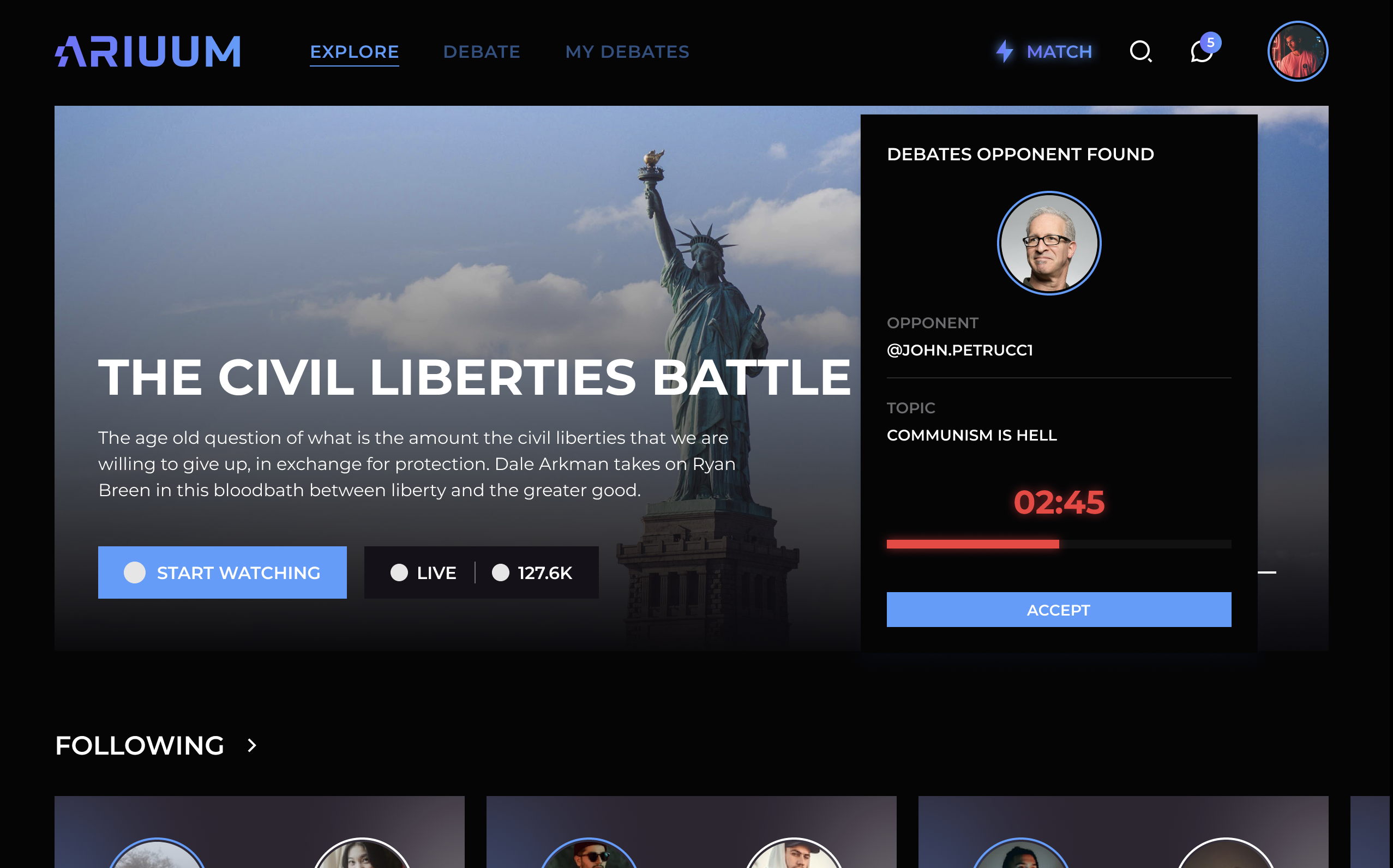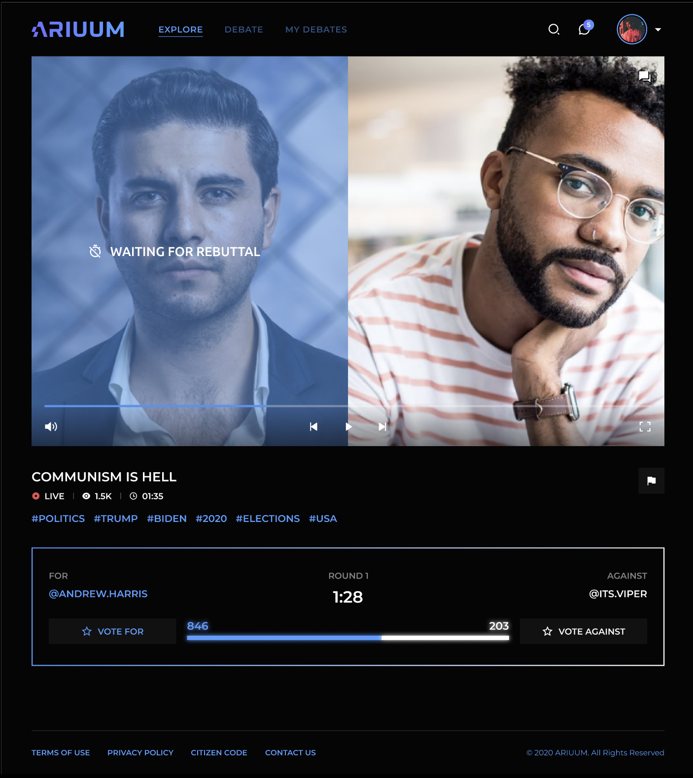Welcome to the future of online discourse! Debate real people within our community in real time. Look for trending debate topics and hashtags to find debates and discussions that interest you! Follow other channels of like-minded individuals and build your own channel to showcase your past live streams. Each month we will be hosting debates and other live events which our citizens can purchase as pay-per-view to watch live or as a replay later.