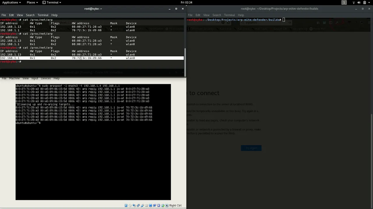 ARPPD protects your PC against Man-In-The-Middle (MITM) attacks. This is a script written in C to provide protection against malicious ARP attacks, which changes the gateway's MAC Address in the ARP table of a victim's PC. The program saves the Gateway's MAC and IP Address when started. It then scans for every incoming ARP packet to see if it has the ARP Source of the gateway's ip. It blocks these packets (without a delay, like in other MITM defending scripts) using arptables, and instantly updates the ARP table to match the gateway's IP and MAC. It keeps the attacker's MAC address blocked from receiving ARP packets for 5 minutes. When the program exists, it allows all MAC addresses to send ARP packets again (to the PC running the script), as well as flushing the ARP table.