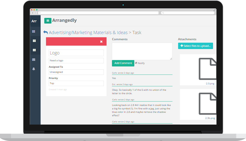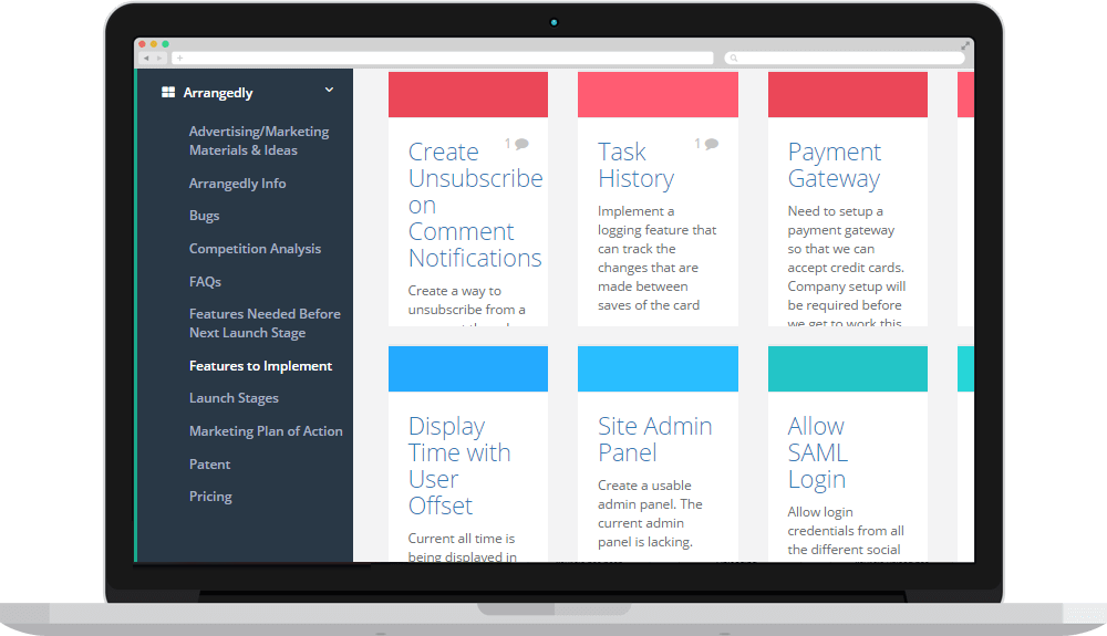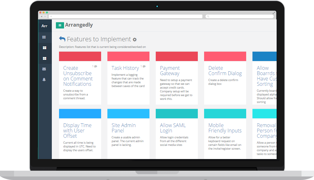 Tasks expressed, arranged, and completed -Create Boards for Categories of Work Create boards that speak to the general needs of your business. These can be based on categories of work, or, if you simply want to manage the workflow of members of your organization, these boards can be named after individuals or teams. -Create Tasks Within these Boards Tasks are created within boards in order to make sense of the work that needs to be done. Tasks can be assigned to individuals or left unassigned. -Arrange the Tasks, If Need Be, According to Importance Our color coded task board allows for the simple arrangement of tasks.