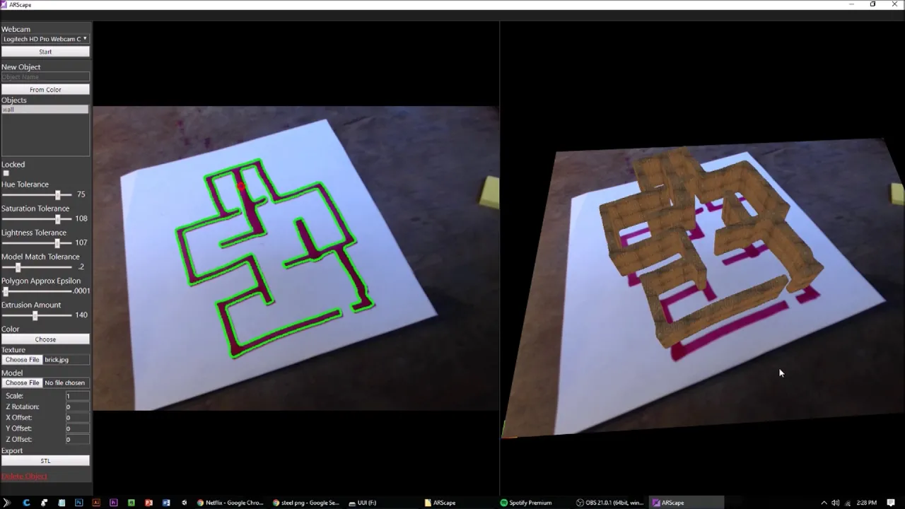 ARscape is a full augmented reality experience on your desk. Bring the digital world into a physical space with nothing but a webcam. ARscape is a free lightweight software that uses computer vision to "see" colored markers (from expo marker on whiteboard to poker chips) and then use them as a base position to upload and track STL/glTF models, extrude custom shapes, attach PNG/JPEG files as textures and colors, and creating entire scenes. All scenes can be exported as STL files for later usage. Construct characters, maps, and more both on your screen and by hand and watch them combine in real time. Reach into a mixed reality world to watch your ideas come to life, from fantasy universes to your latest kitchen remodel.