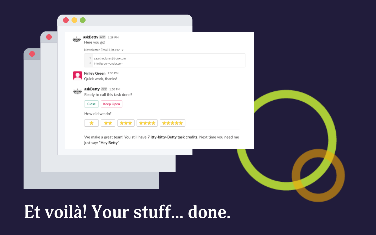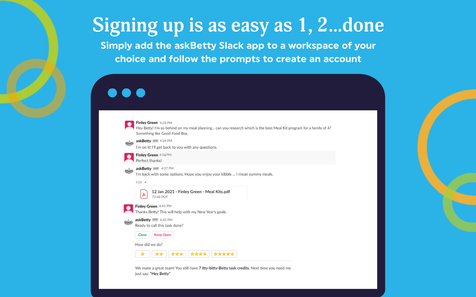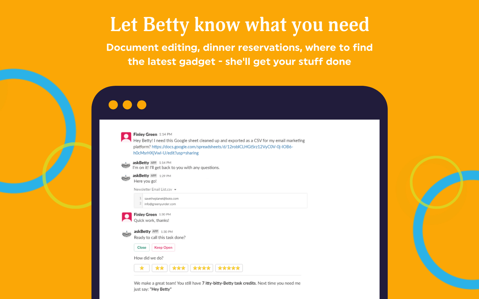 askBetty gives Slack users instant access to a live personal assistant who can complete bite-sized admin or concierge-type tasks throughout the workday. Through a tailored one-to-one conversation, users can ask Betty to: > Review social media copy and add hashtags > Source quotes from service providers > Secure dinner reservations > Transcribe audio files into formatted meeting minutes ... And more Simply add the askBetty Slack app to a Slack workspace and say “Hey Betty” to start delegating your to-do’s. The app leverages Virtual Gurus’ community of Canadian- and US-based virtual assistants to help you achieve more in less time through the convenience of Slack.