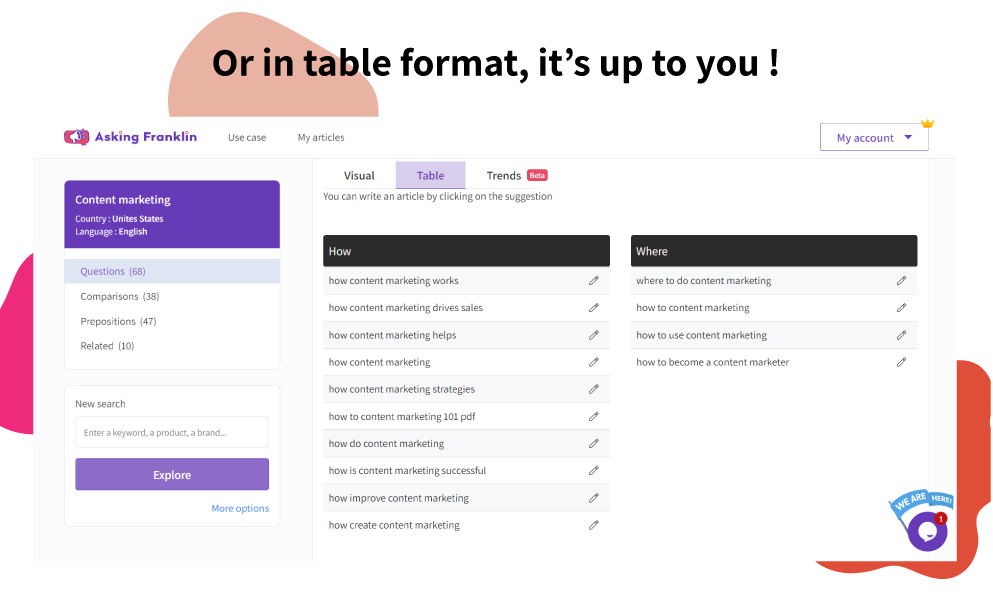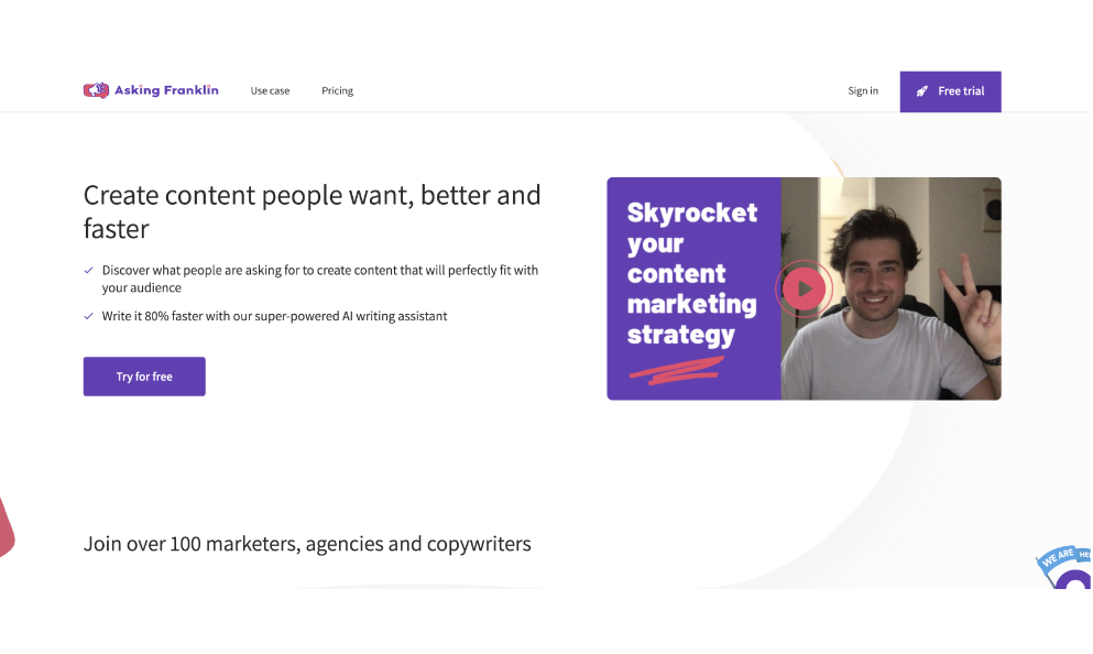 Asking Franklin is the only tool that allows you to discover what people are looking for on Google, AND also guides you to write the content pieces you need, thanks to AI ! ? Why do we build Asking Franklin ? We started with a simple observation: writing content is not as easy as one might think... More often than not, you don’t know where to start. Either because you don't know what you should be writing about, or what type of content will please your audience. ? So we decided to create a tool that answers all these questions. But we didn’t stop there and we did more than any other tool on the market.