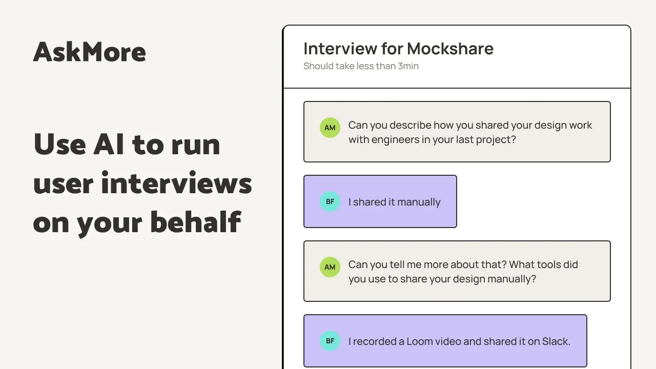 AskMore uses AI to run user interviews on your behalf so you get more feedback, faster, and in any language. Just explain AskMore what you're trying to learn, and it will generate an interview link that you can share with your users or leads. On this link, they'll get interviewed by an AI that will follow user research best practices and dig deeper to make sure you always get the insights you need.