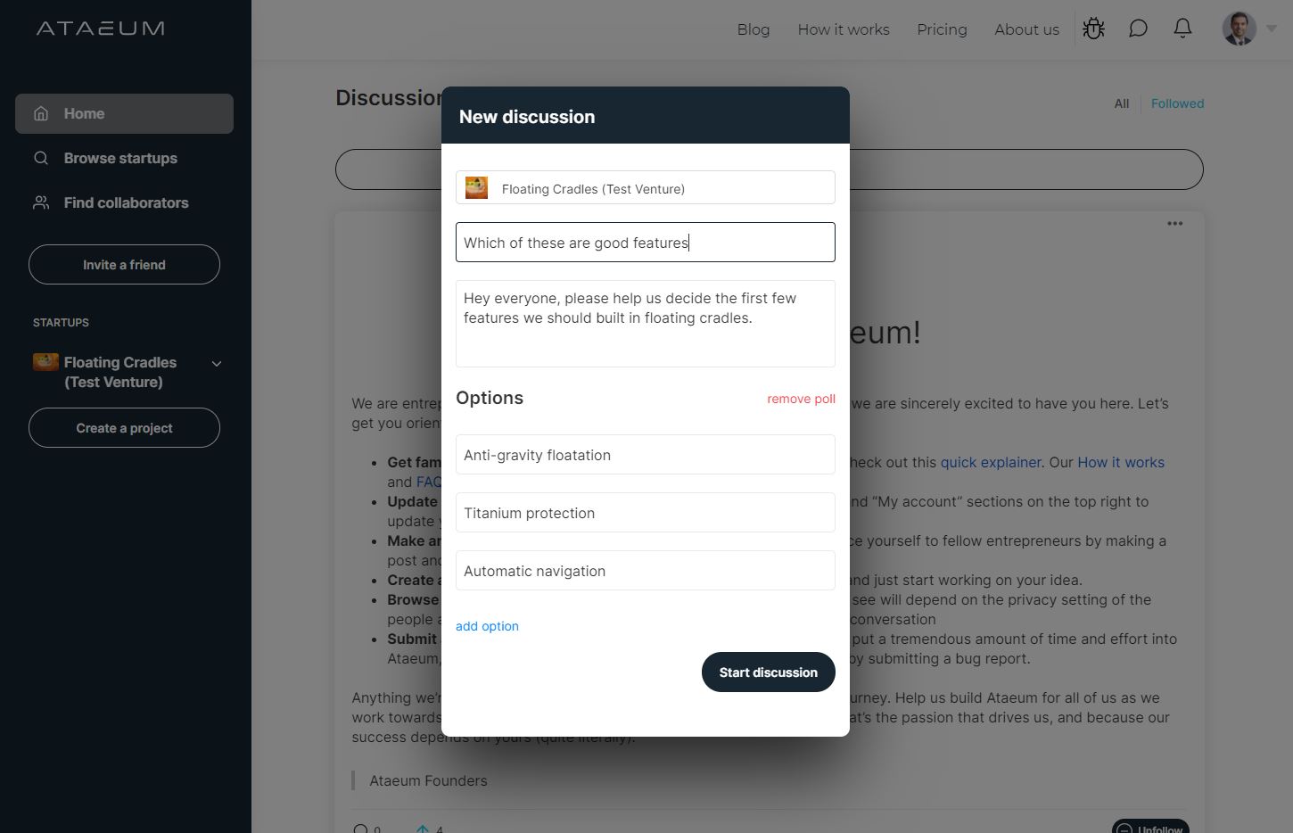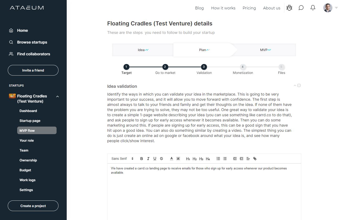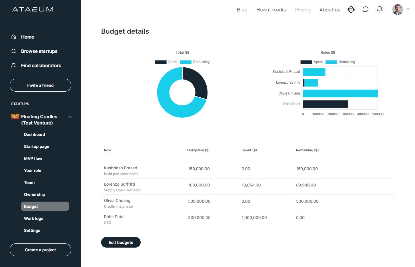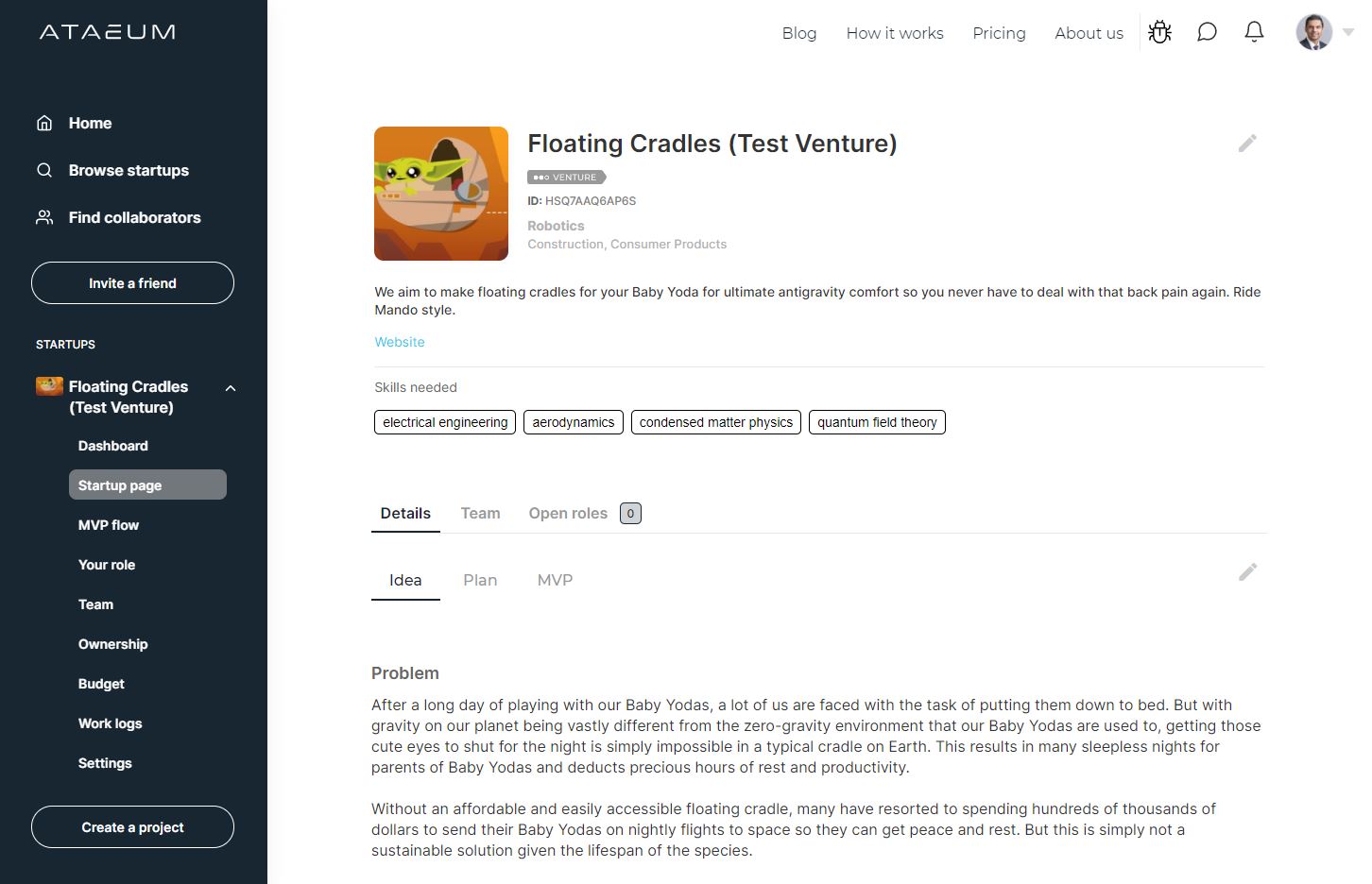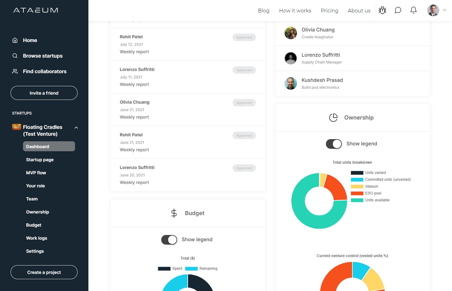 Ataeum is an all-in-one platform to find co-founders and bootstrap startups in an automated, low-cost, no-paperwork way. Ataeum's innovative work-based weekly smart vesting minimizes co-founder uncertainty and conflicts, and facilitates fair ownership based on the amount of work done. Ataeum platform creates and manages a joint venture to enable you to run your startup in a lightweight and automated way. In contrast to the usual startup founding, you don’t have to worry about things like incorporation, bylaws, stock options, state qualifications, bank accounts etc. until you make revenues or decide to incorporate.