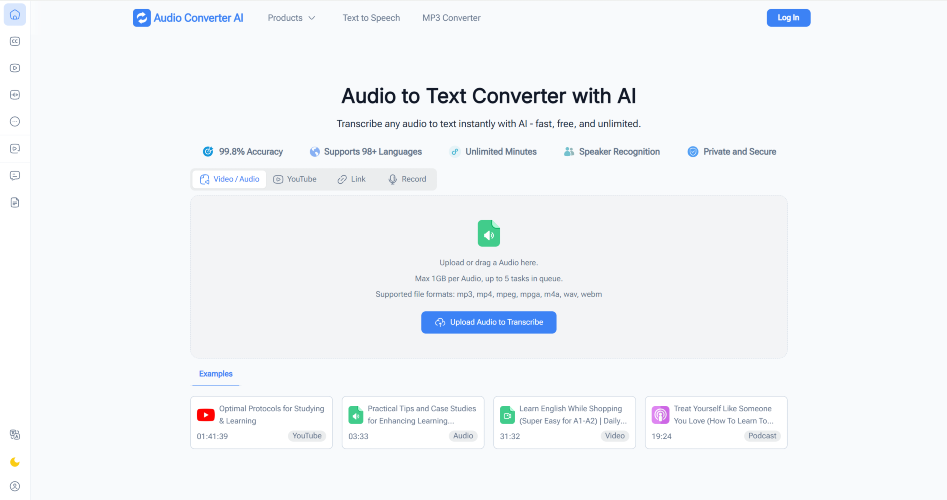Audio Converter AI instantly converts audio to text online using advanced AI. Free, unlimited, and easy to use - perfect for lectures, podcasts, interviews, and meetings.
