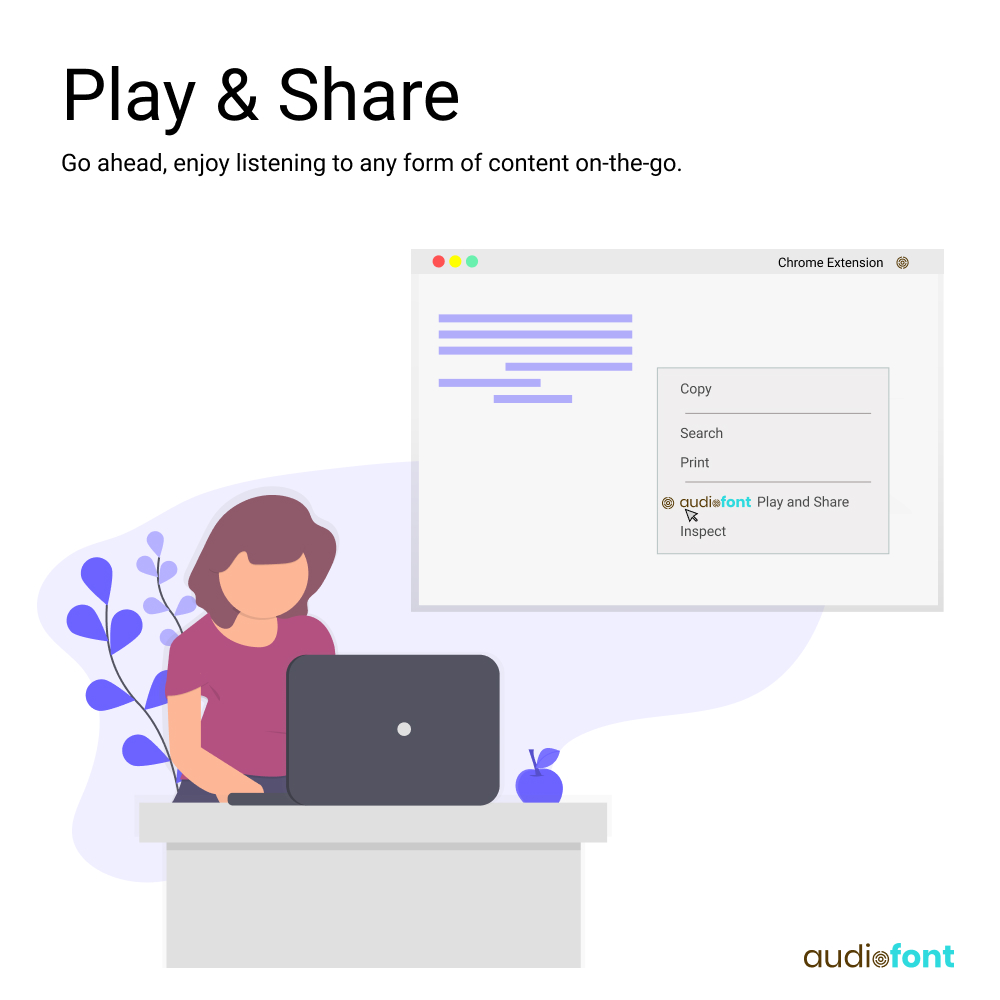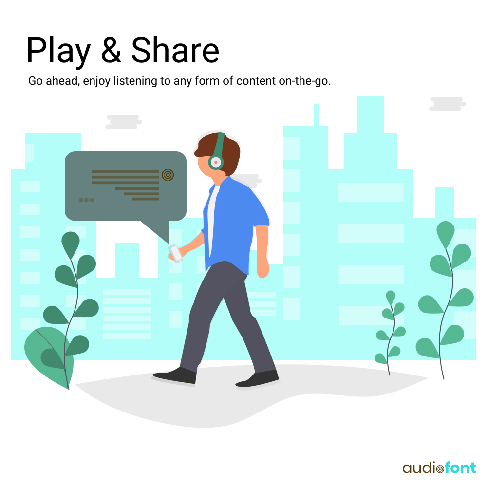 About Audiofont Audiofont is a tool to convert text into speech. It allows you to convert all your text files like blogs, articles, E-PDFs, E-books and other online text content. Listen to audio anywhere, anytime All the stuff you need to enjoy your favorite content on the go makes this a must-have tool in day to day life. Listen to online stories, favorite blogs, E-PDfs, E-books, and other online content on-the-go Features Free to Use-Audiofont is free and you are allowed to use the speech files for personal and commercial reasons. Easy Conversion-Audiofont converts all the online text, PDFs, E-books, web pages and other content to audio files. Customize Speech Rates-Choose the speech rate that works for you. Comfortable at a slower pace? You got it! Download Audio Files-Audiofont enables you to download the text to speech converted files. Share the Audio Files-Make the converted text to speech audio available on social media platforms Rest your eyes-Let Audiofont do the reading. You can sit back and relax while listening to audiofont.