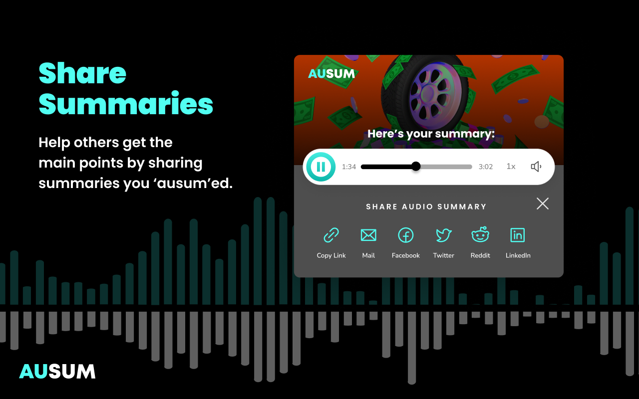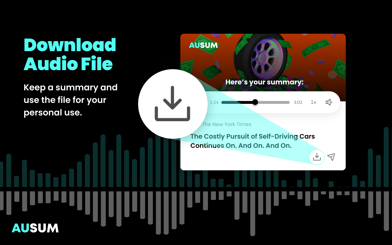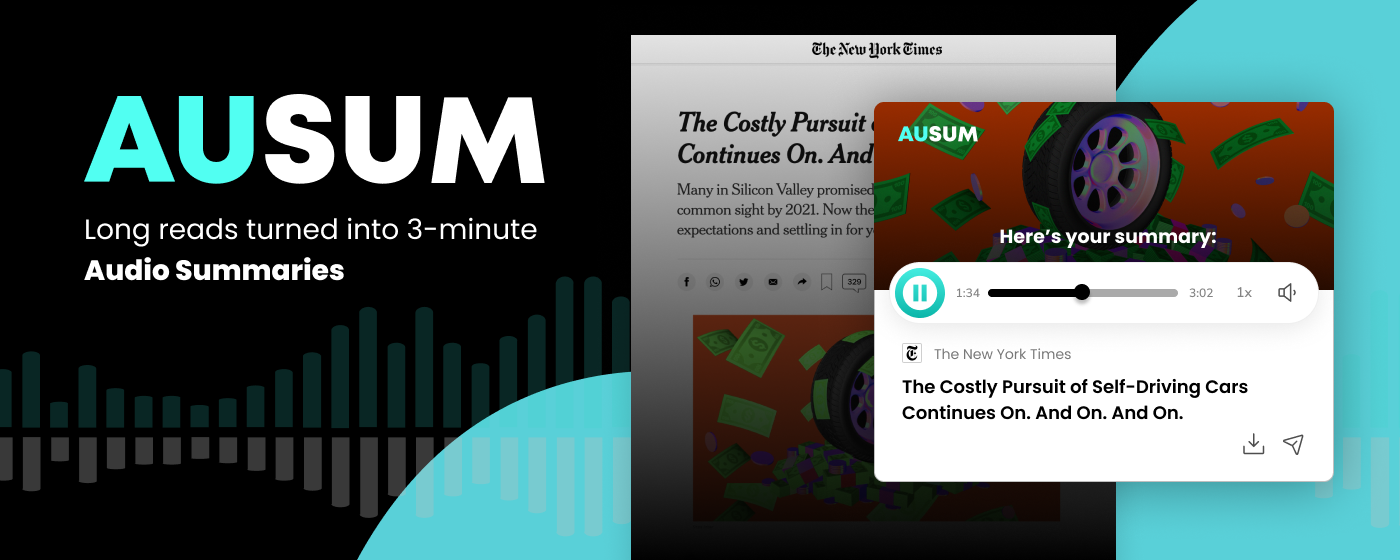 Ausum is a free online article summarizing tool that turns any article into an audio summary, so you could listen and learn, anytime, anywhere. One-click and Ausum will generate any article into less than 3-minute audio, in seconds. - Skip the fluff: no sign-up required - Concise and accurate: AI technology that you could count on - Seamless: skip the paywalls, ads, and other media junk. One-click, it's words to your ears. - Audio: listen while walking or deep-diving the web, audio helps maximize your time. - Download: Download all your articles so you could listen anytime, anywhere - Humanized: high-quality, natural text-to-speech technology for a real listening experience - Share: share summaries with friends