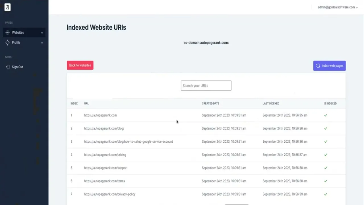 Auto Page Indexer enables users to put their SEO on autopilot by automating all of their websites' web page indexing. Auto Page Indexer is the fastest and simplest way to index all of your websites' pages on Google. Typically Sitemap indexing takes anywhere from 4-20 weeks but the Index API usually takes less than an hour! Get indexed immediately, not in 3-6 months!