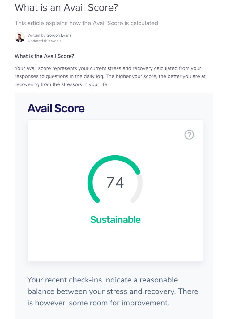 Avail monitors changes in your mood, energy, stress, sleep quality and more using digital check-ins. Avail then suggests personalized action plans and support resources to improve your well-being and help you be your best you. Digital Check-ins - Your Well Being Report Use Avail's industry first, digital check-in to observe the many dimensions of your overall well-being. Avail identifies both potential areas of improvement and opportunities for personal growth. Care Centre - 24/7 Access to Care Resources Anytime, online access to personalized support content, health professionals, your organization’s care network, and best-in-class crisis support. Personalized Action Plan - Insights To Act On As you complete check-ins, Avail learns about you and personalizes your experience. If Avail identifies a potential issue, it guides you towards the support care options most helpful to you, so you can address issues early, before they become a serious problem.