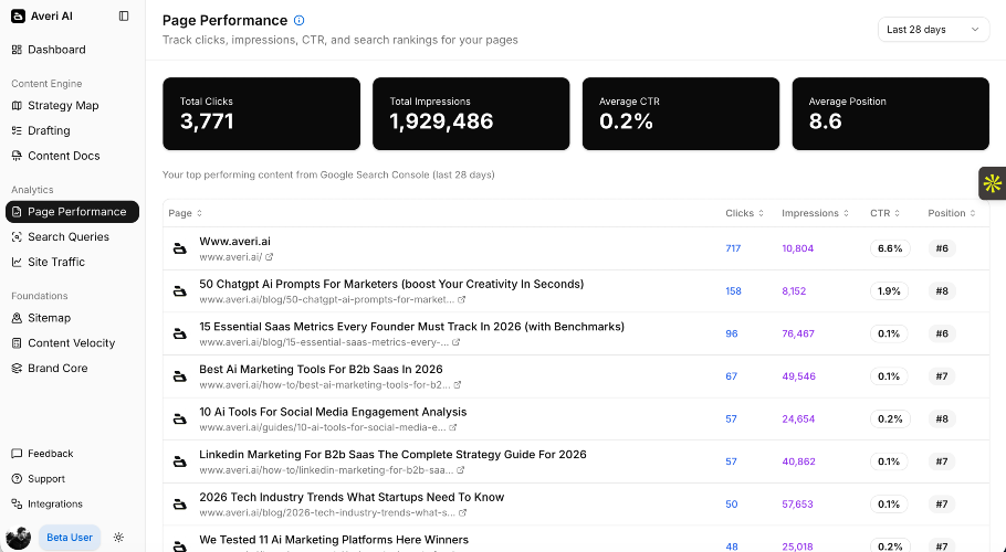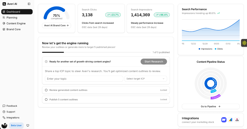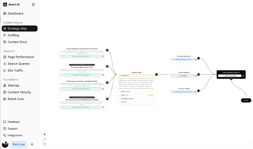 Averi is the AI content engine built for startups. One workflow to run a content engine that ranks on Google, gets cited by AI, and turns increased visibility into customers. Research. Draft. Publish. Optimize. Repeat—all in one flow. Averi monitors trends, tracks competitors, and queues high-value topics automatically. You choose what gets drafted, refine it, and publish directly to your CMS. Every piece is stored in your Library—so Averi automatically builds content clusters, links related posts, and gets sharper with every publish. An engine that never stops learning. A strategy that continuously compounds.