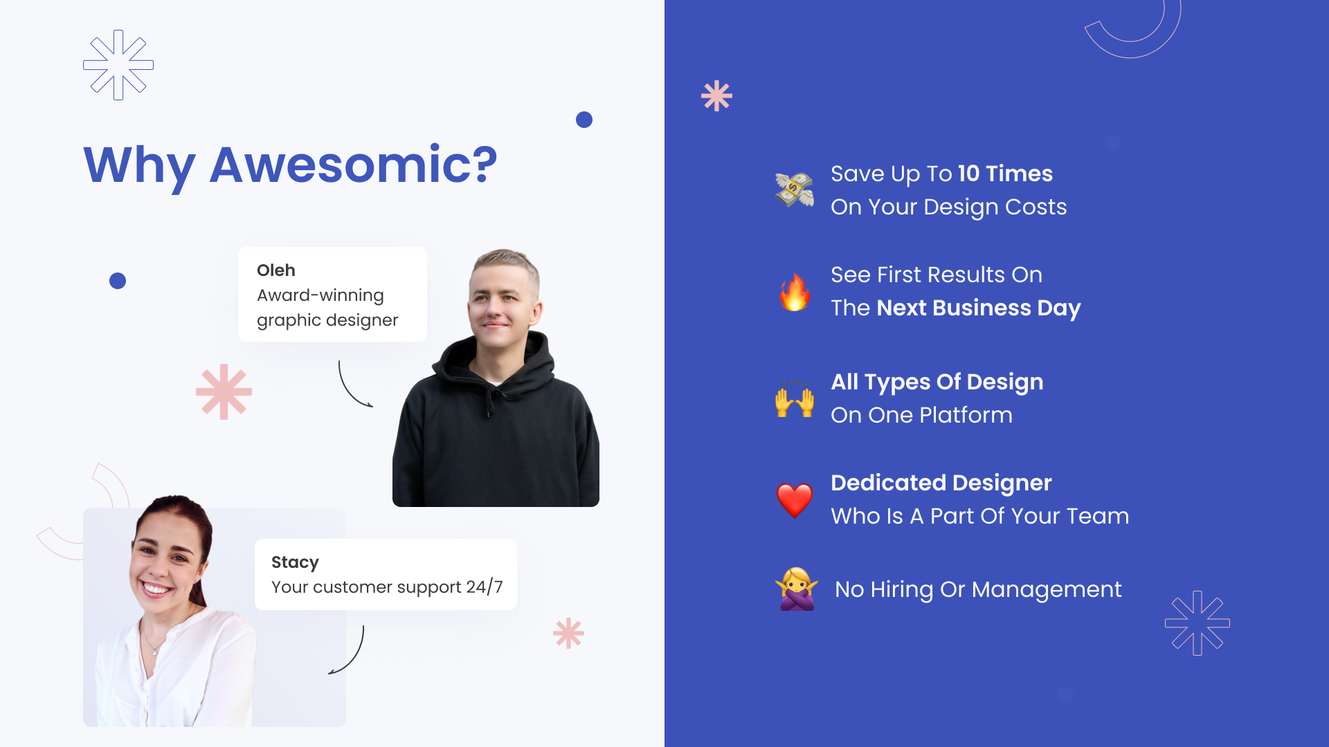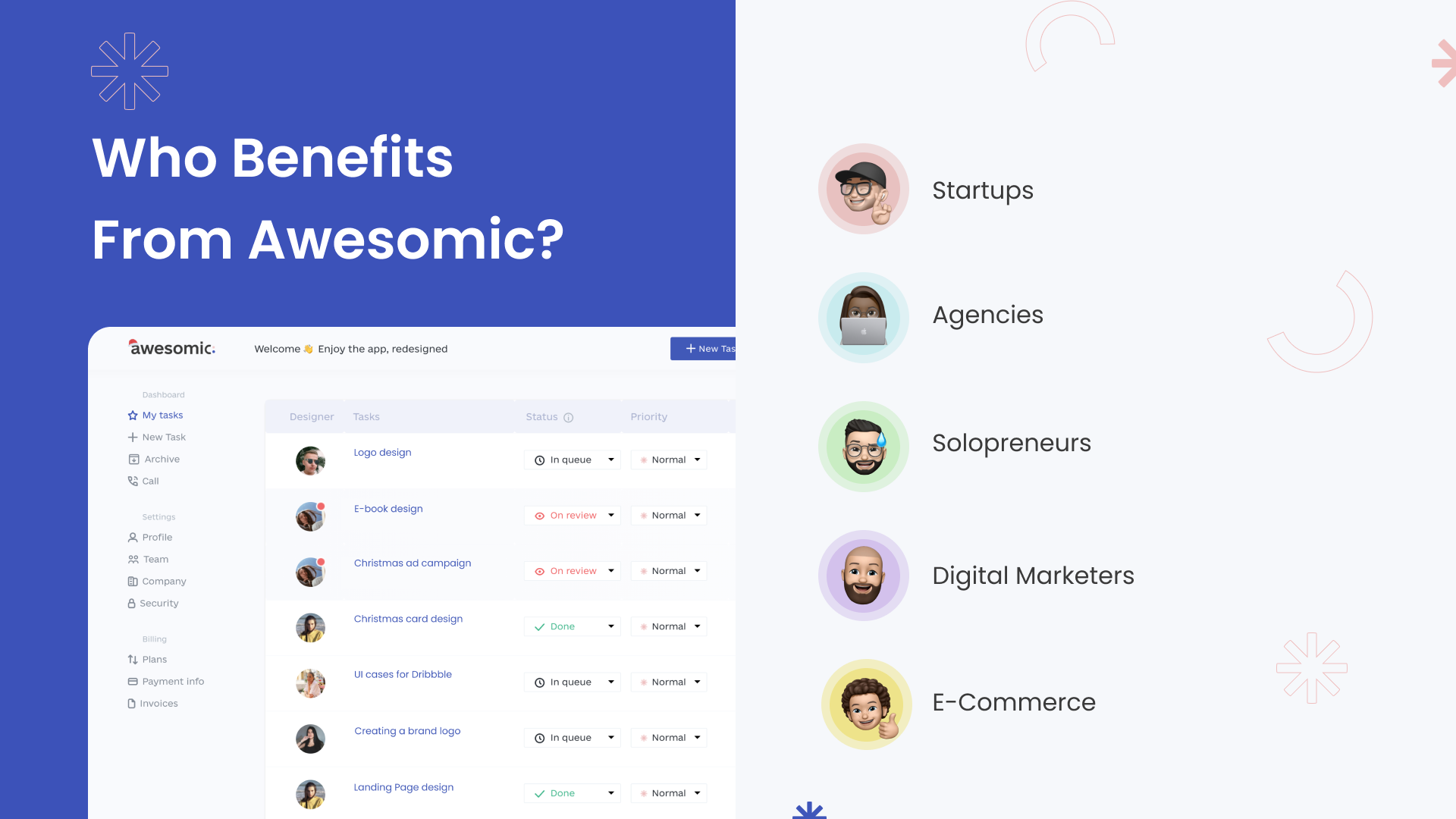Awesomic is an app where your design task is matched with the best-fit designer, and you get results on the next business day. No hiring, no management, no stress. Our high-class specialists create graphic, UI/UX design, and animations that help companies address their business needs and achieve goals. And all of this costs up to 10 times less than one full-time expert. If you are looking for a top designer with a proven industry expertise who won’t cost you a fortune, turn to Awesomic. Awesomic - we match awesome companies with cosmic designers :)