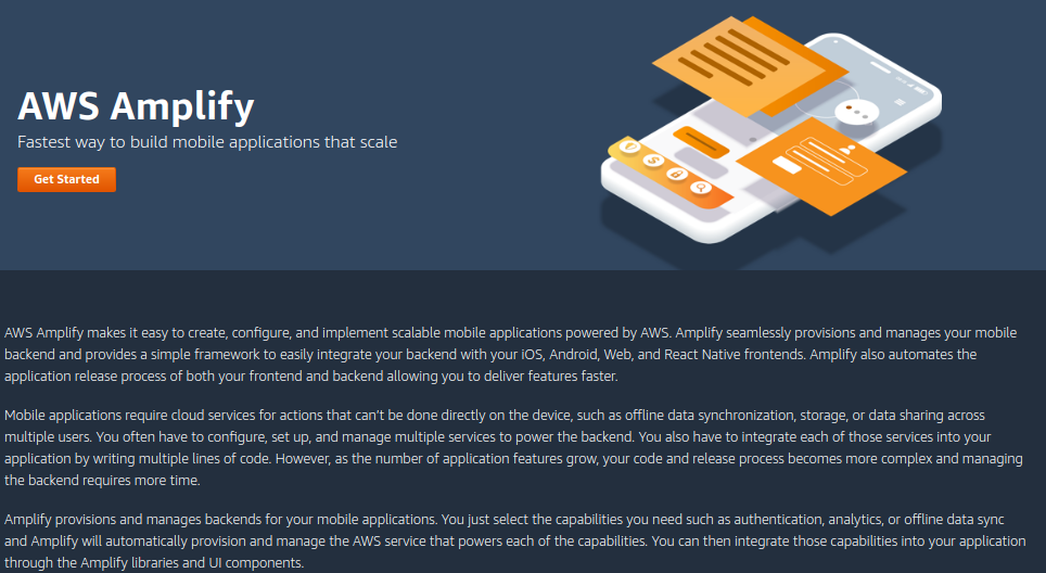 AWS Amplify makes it easy to create, configure, and implement scalable mobile applications powered by AWS. Amplify seamlessly provisions and manages your mobile backend and provides a simple framework to easily integrate your backend with your iOS, Android, Web, and React Native frontends. Amplify also automates the application release process of both your frontend and backend allowing you to deliver features faster. Mobile applications require cloud services for actions that can’t be done directly on the device, such as offline data synchronization, storage, or data sharing across multiple users. You often have to configure, set up, and manage multiple services to power the backend. You also have to integrate each of those services into your application by writing multiple lines of code. -Easy to use -Scale with your business -Better customer engagement