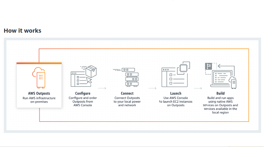 AWS Outposts bring native AWS services, infrastructure, and operating models to virtually any data center, co-location space, or on-premises facility. You can use the same APIs, the same tools, the same hardware, and the same functionality across on-premises and the cloud to deliver a truly consistent hybrid experience. Outposts can be used to support workloads that need to remain on-premises due to low latency or local data processing needs. -Extend AWS on-premises -Choice of management planes -Fully managed -Future-proof infrastructure