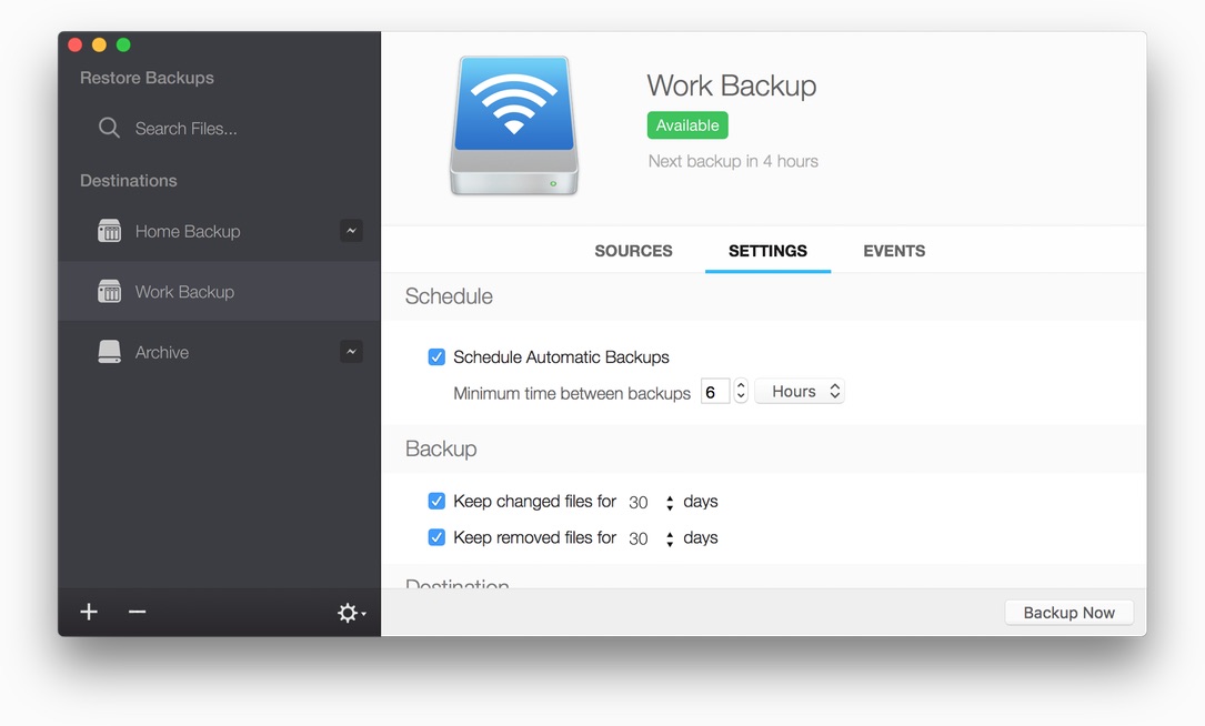 Flexible Backups to Multiple Locations Easily configure multiple backups to your NAS or External Drives. Simply drag in external destinations, like folders on a NAS share or external drive, and let Baccus figure out the rest.
