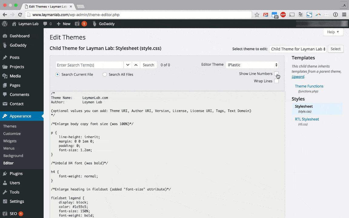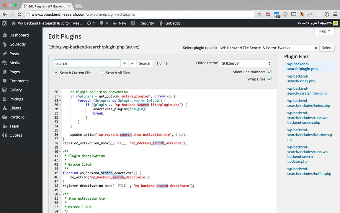 With the WP Backend File Search plugin, there's no need to open each PHP, CSS and JS file individually to find the code you're looking for. Search better and improve your WordPress experience! This plugin was created to speed up your WordPress development, editing and tweaking - for those instances when you know the code you're looking for, but don't know which file it's hiding in. Now you can search all Theme or Plugin files at once. It's a huge time saver, because the search results will show you the filename and line number where your search term was found - along with a direct link to view and edit the file. We've also included additional features to improve the default WP editor, like Line Wrapping (so your code fits better within the editor window - no more side-scrolling!), Color Themes (to change the look of your theme & plugin editor), and Line Numbering (to keep your editor neat & organized).