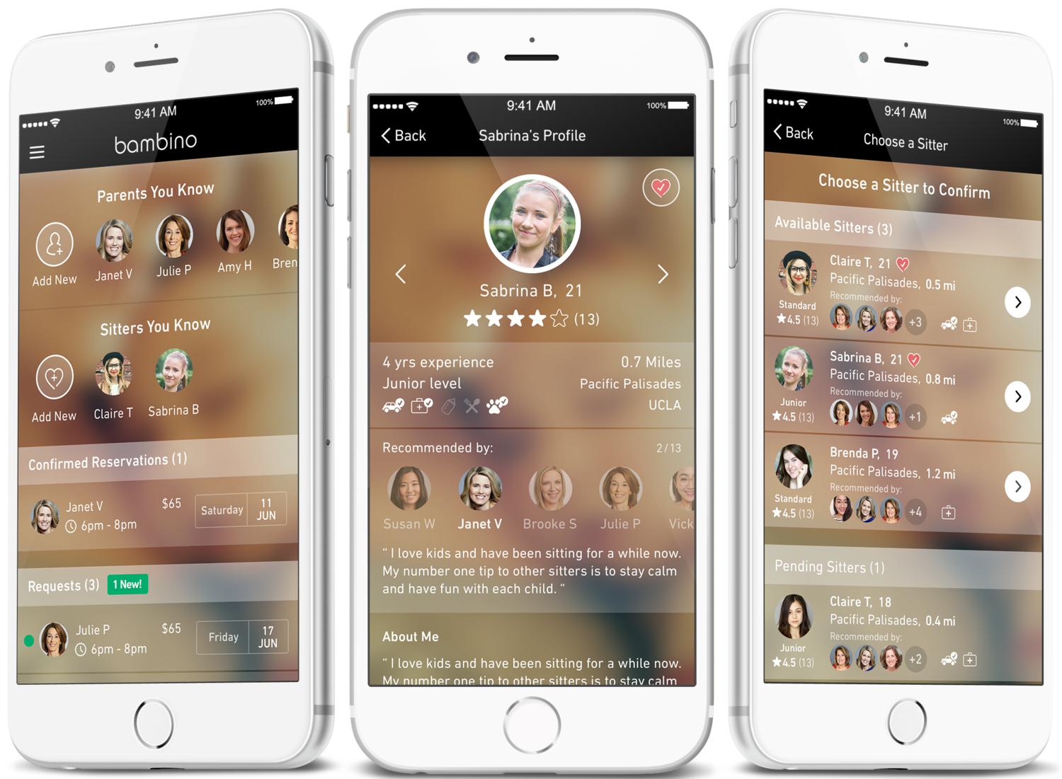 SIMPLE, RELIABLE, AND EASY TO USE Reintroduce flexibility to your life with babysitters your friends and neighbors trust. Bambino is a babysitting app that modernizes the way we find, book and pay trusted neighborhood Sitters. -Find See who your friends recommend or who the neighborhood loves. Finding a reliable Sitter has never been easier. -Book Simply enter your booking details, select sitters in your own neighborhood and confirm the best one for the job. -Pay And when it’s all said and done, simply pay and rate your Sitter through the app. It’s that easy!
