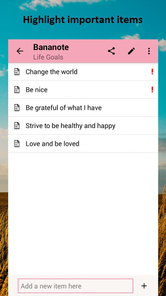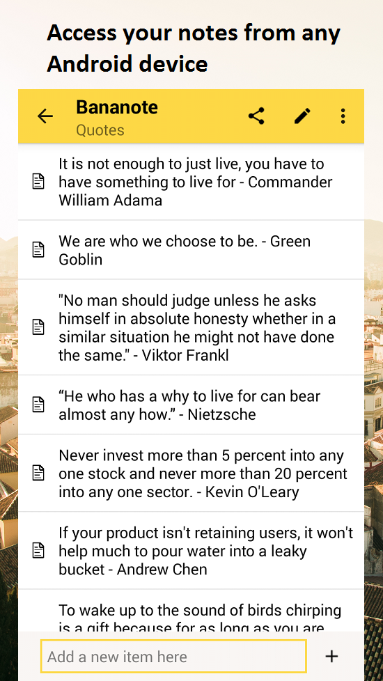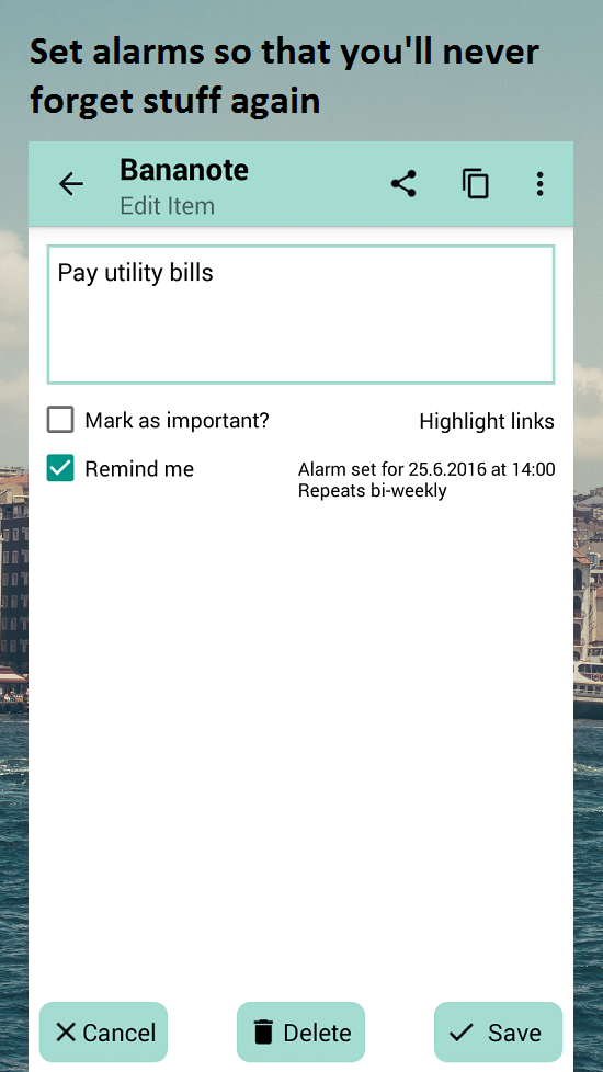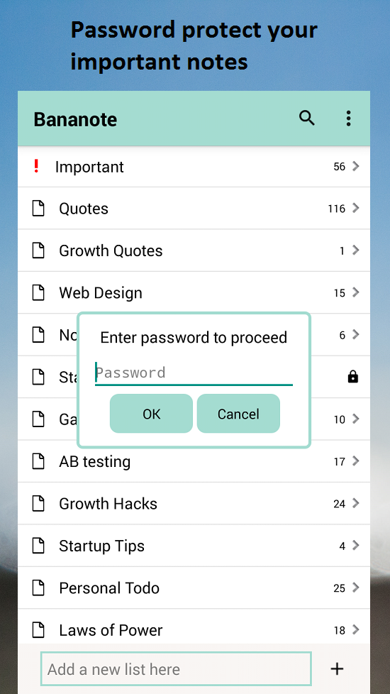 Bananote is a fast loading, no nonsense, easy to use note taking app. Quickly add notes in just a few taps. Edit or delete unwanted notes with just a swipe. Lock your private notes with a password or mark important items with an indicator. Taking notes is as simple as it can be with Bananote. Features: 1. Fast note taking: Write notes with just a few taps. Open the app, begin with a note title, start adding your notes, save them and Voila! You're done! 2. Notes as lists: Who doesn't love lists? Create to do lists, shopping list, grocery list and more easily. 3. Easily edit and delete notes: Swipe to highlight or delete notes. Less mistakes, less time wasted. 4. Bookmarking: Got an important note you want to pay special attention to? Mark it as important, and an icon appears next to it so you won't miss it! 5. Cloud Synchronization: Left your mobile phone at home and can't access your notes? Download Bananote, sign in from another mobile phone and you gain access to all your notes. 6. Password protection: Some things are meant to be secret, so password protect your top-secret notes! Even if your phone is stolen or lost, your password protected notes will never be read by anyone else. Your notes stay safe and sound. 7. Personalization: Don't like yellow? Choose a color scheme that suits your style! 8. Powerful Search: Addicted to taking notes and now you have too many notes? Don't worry, you can search for notes as fast as adding them. 9. Reminders: Bananote works like an alarm clock by reminding you either on a daily, weekly or bi-weekly basis of the important stuff. 10. Note sharing: Easily share your notes with your friends and family. Don't let note taking be an awful experience. Let Bananote work for you, not the opposite. Download it now and see the difference.