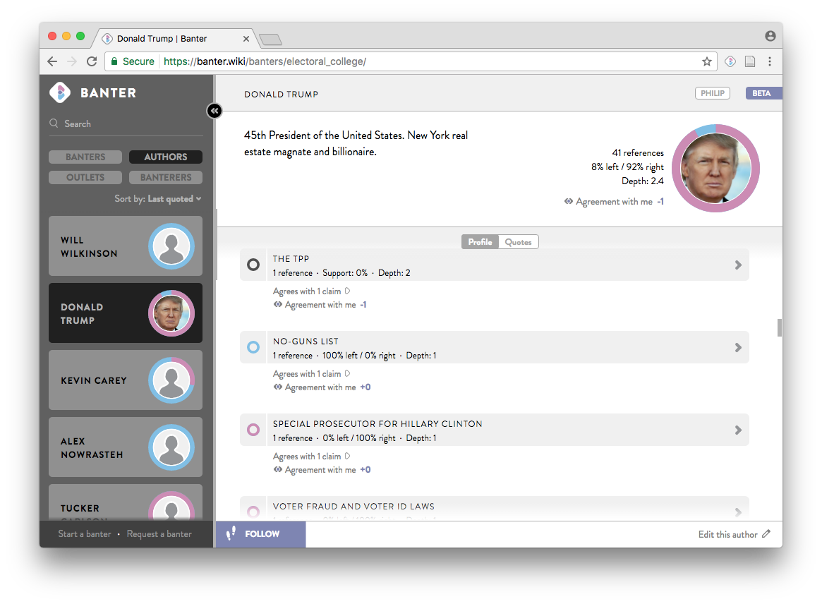 Americans are more polarized than ever. A lot of people have come to think of politics as a war of arguments between Left and Right, and have almost lost the ability to process political information in other terms. Research says the internet, making it easy for people to form echo chambers, is largely to blame. One fix is to set up a politics/news site that are objective and above the fray (like Vox, which claims to "explain the news"). But inevitably that site becomes associated with a "side" (the left, in Vox's case). Then everything they publish is attacked by outlets on the other side, the readers segregate, and we're back to square one. Banter takes the opposite approach. It's a wiki for politics that presents issues as the trees of partisan arguments they really are, so that the user is sort of forced to learn arguments from both sides at once. Check it out, contribute to the discussion, and help us make the internet a better place.