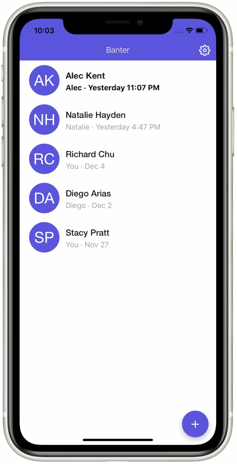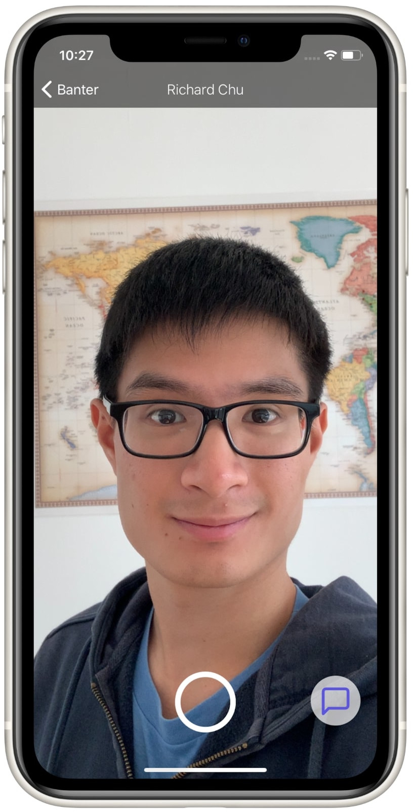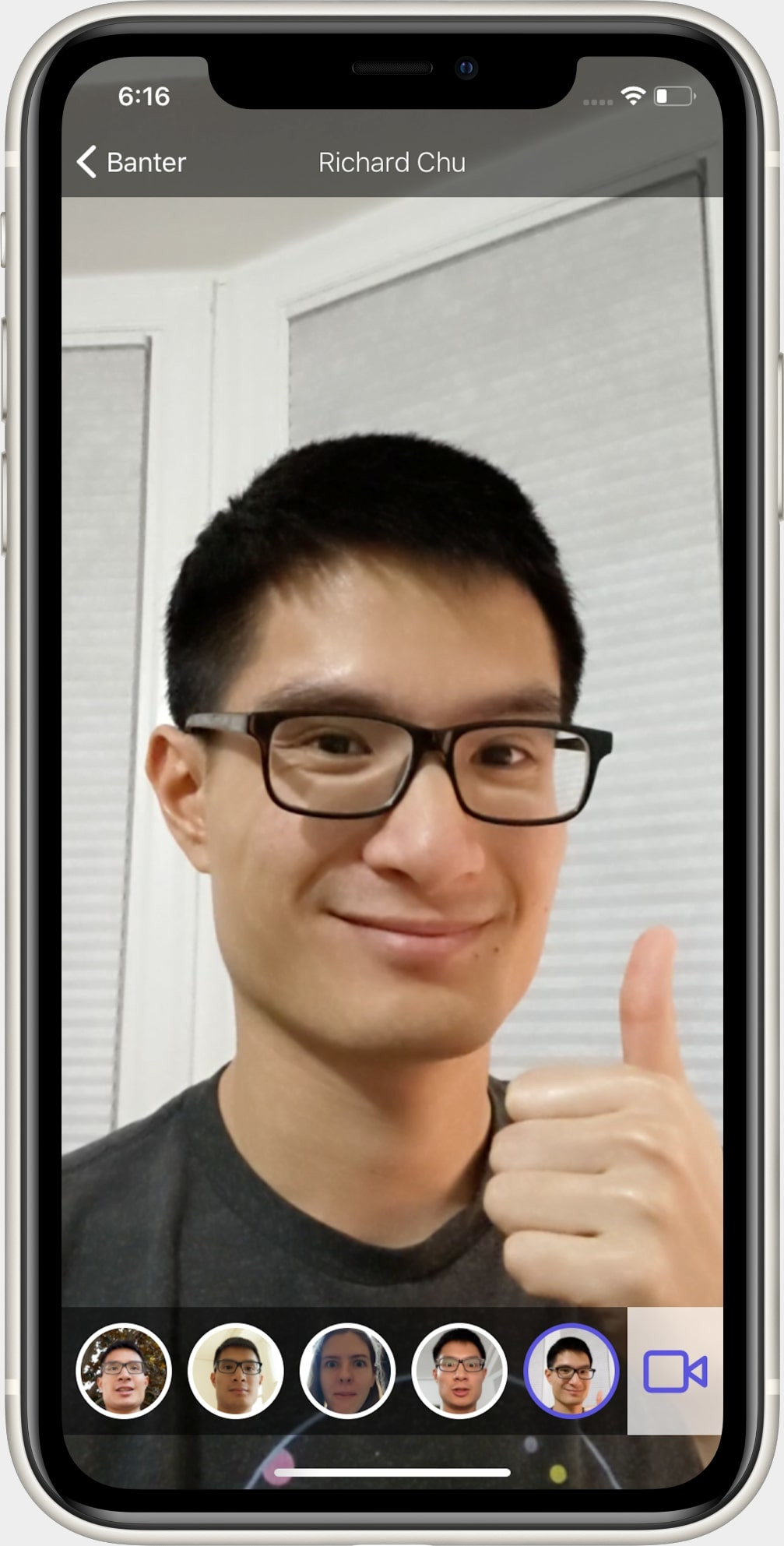 Banter is a mobile app that lets you send video messages to your friends and family. It's like a longer-form Snapchat that's focused on conversation instead of on the camera. It's more personal than texting, because you can actually see people's faces and hear their voices, and it's more convenient than video chatting, because it doesn't rely upon you having synchronized free time with other people.