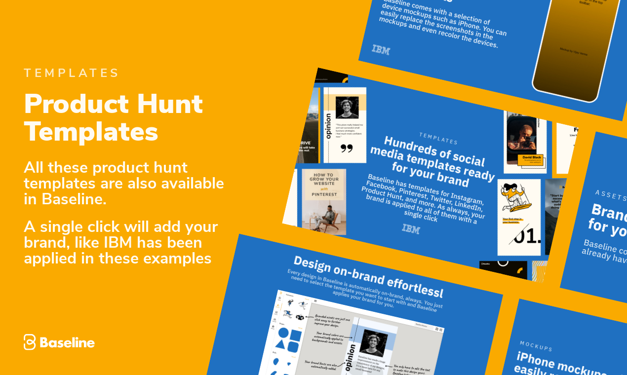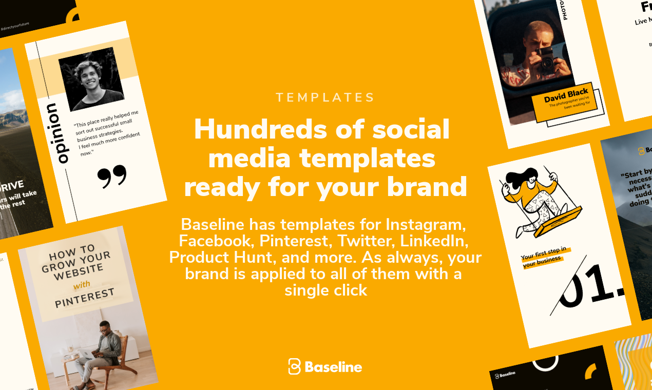 Baseline is a design tool that helps you create on-brand content at incredible speed. Here is how it works: First Baseline helps you create a solid brand guide by guiding you through a few simple steps. The brand guide gives you everything you need to keep your brand consistent across different platforms by making it easy to copy-paste values and CSS to wherever you need. Then Baseline Studio takes over. There you will find hundreds of templates for Instagram, Facebook, LinkedIn, ProductHunt, and more. All of which only need a single click to apply your brand to. No cumbersome color changes, font changes, or logo changes are required. Baseline takes care of all that for you. All you have to do is edit the text and images. As a result, Baseline makes content creation for your brand amazingly simple. It saves a lot of time when compared to alternatives like Canva. Something that could take hours can take under a minute.