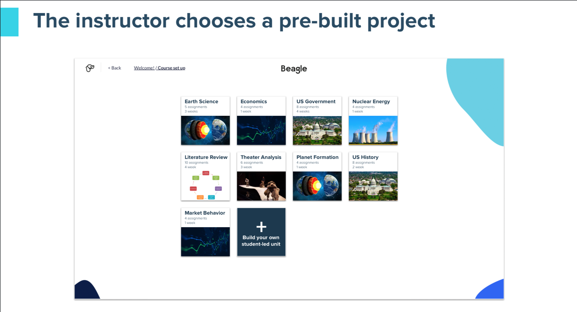 The Beagle interactive learning app increases engagement and retention by guiding students toward a goal through a real-world learning process of questioning, finding information, analyzing that information, and sharing learnings collaboratively with a team. The app includes pre-built templates for case studies, student research, projects, capstones, or discussions that can be activated by an instructor in seconds.