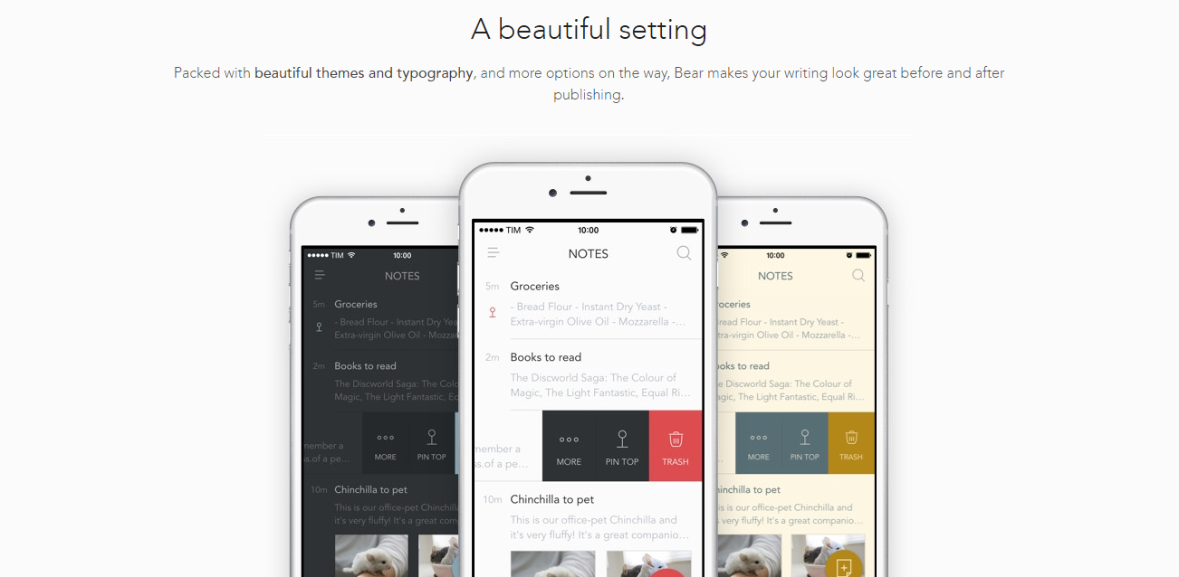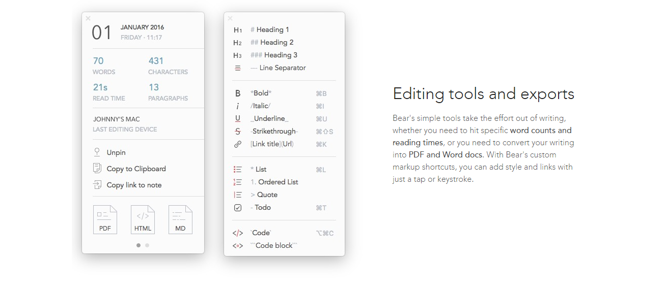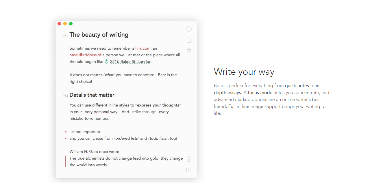 Bear is a beautiful, flexible writing app for crafting notes and prose. Use it everywhere Bear works on iPhone, iPad, and Mac, so you can write wherever inspiration strikes. Use todos to stay on task across every device. Keep control Link notes to each other to build a body of work. Use hashtags to organize for the way you think. All notes are stored in portable plain text. Write your way Bear is perfect for everything from quick notes to in-depth essays. A focus mode helps you concentrate, and advanced markup options are an online writer's best friend. Full in-line image support brings your writing to life. A beautiful setting Packed with beautiful themes and typography, and more options on the way, Bear makes your writing look great before and after publishing. Editing tools and exports Bear's simple tools take the effort out of writing, whether you need to hit specific word counts and reading times, or you need to convert your writing into PDF and Word docs.