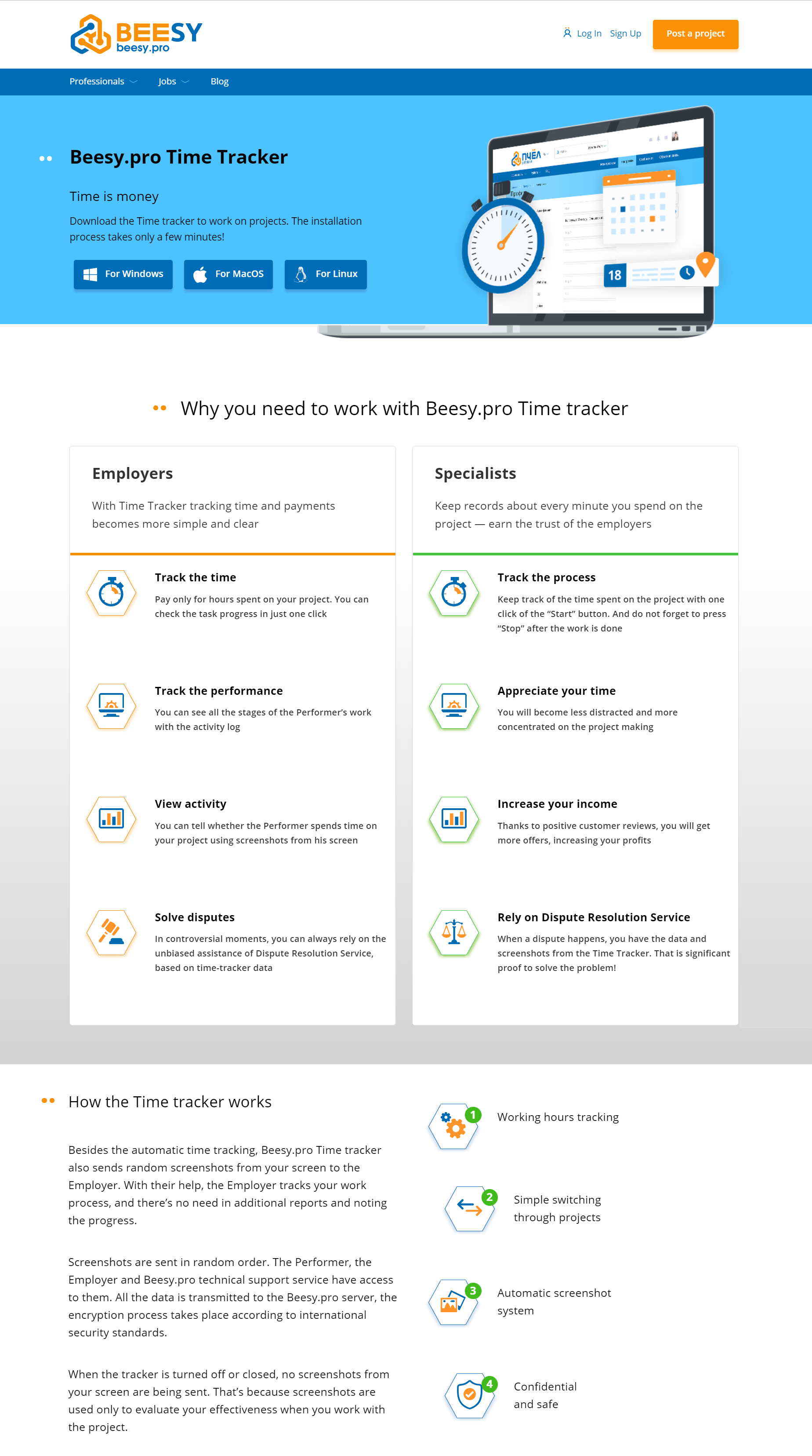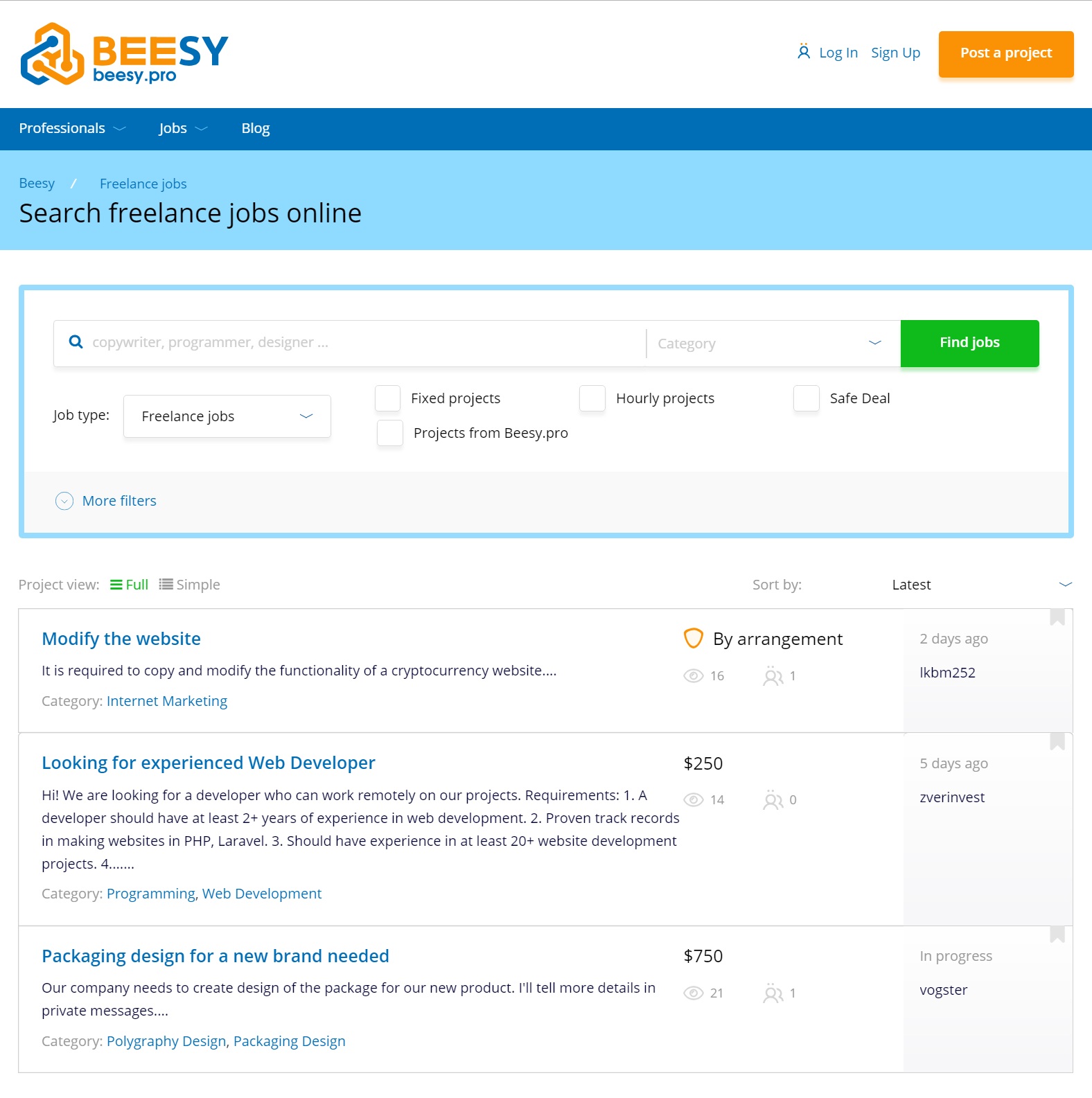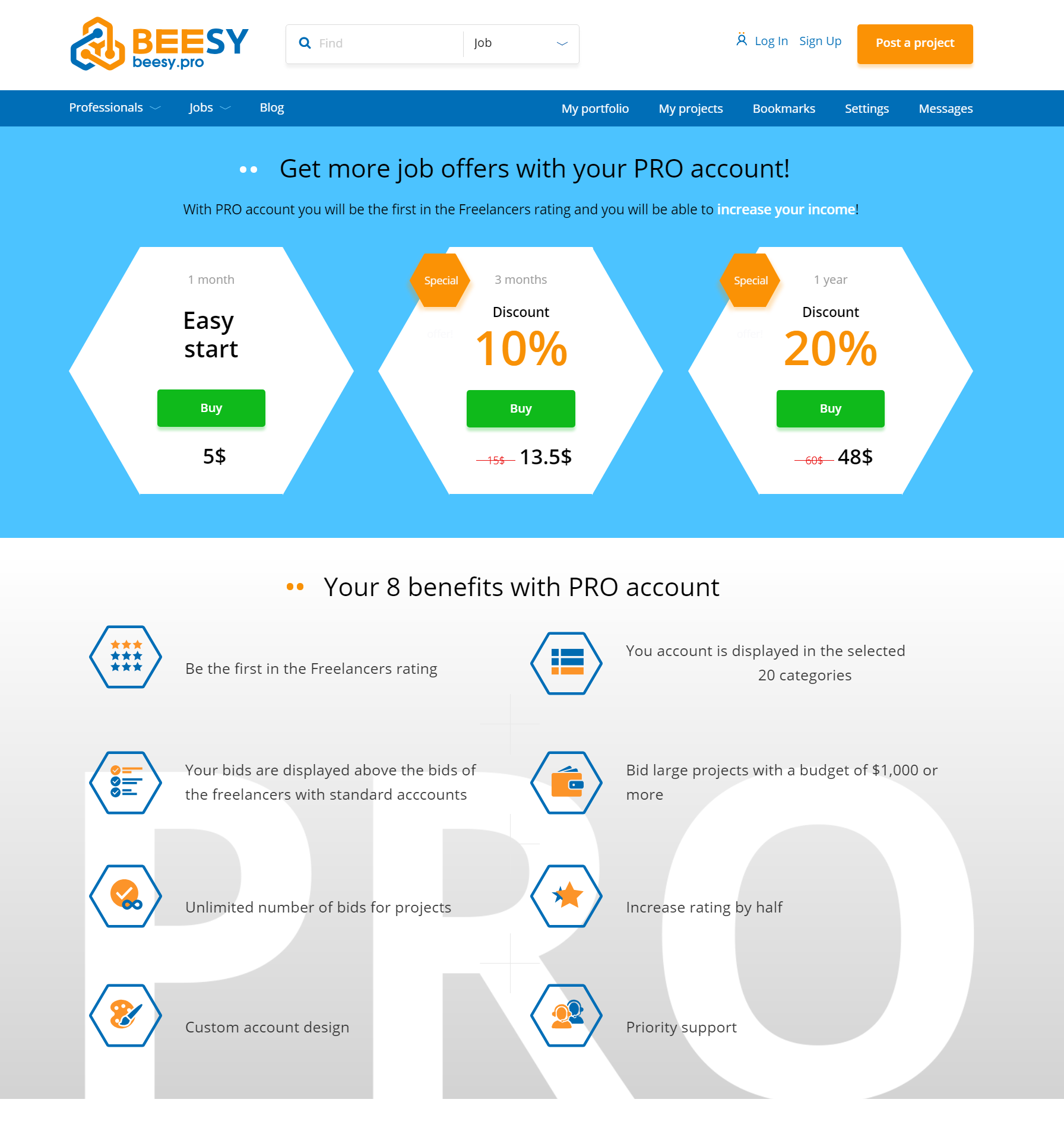 Upwork + Fiverr + Indeed = Beesy.pro Employees can search on Beesy.pro for full-time jobs, remote work and offer own services. Employers don't need to spend time on searching for a performer of work on various websites, Beesy.pro allows to find all kinds of IT professionals for any needs. Beesy.pro was created on the basis of Russian version - Pchel.net that in five months after launch has reached a competitive level and shows a stable growth of registered users.