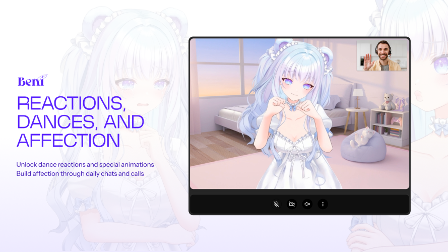 "Most AI talks to you. Beni sees you. Beni is a real-time AI companion that reads your expression, hears your voice, and remembers your story. Not a chatbot. Not a script. A living presence that reacts to how you actually feel — and grows with you over time. See your companion come alive through synchronized animation, voice, and emotion. Choose how your relationship works - friend, confidant, or something more. Every conversation shapes who they become. Create your own companion in Beni Studio. Design their look, pick their voice, craft their soul. Share them with the world or keep them yours. This isn't AI that forgets you tomorrow. This is AI that knows you were sad last Tuesday."