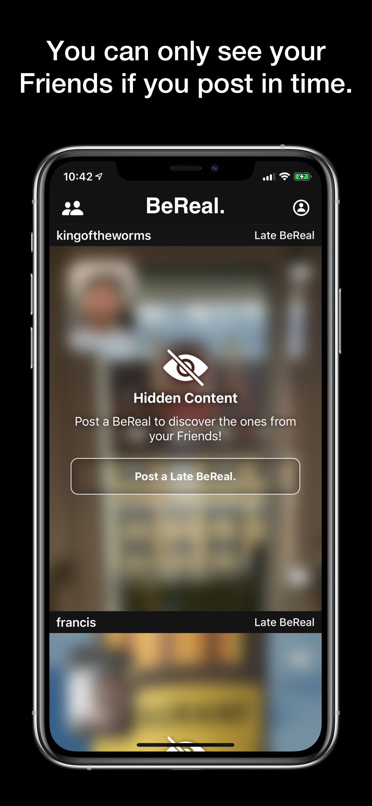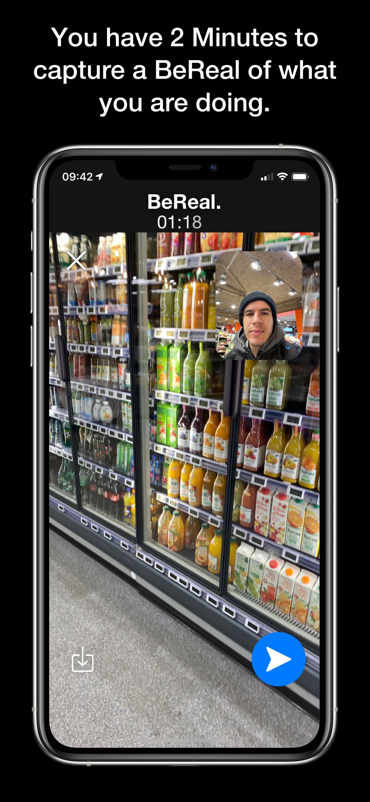 BeReal is the first Uncontrollable network to share once a day your authentic moments in Photo with your Friends. Everyday at a random time, everyone has to capture a Photo in 2 minutes. Capture and post in time to discover what your Friends are up to. When the new notification arrive, your timeline reset and start all over again, everyday. CAMERA • The camera on BeReal is quite unusual, it's actually taking a super high quality picture of what is in front of you and a selfie at the same time. DISCOVERY • Share your BeReal publicly and discover what other people are doing around you. COMMENTS • Comment your friend's BeReal et chat with all his friends. MAP • See where all your friends are when they take their BeReal. /!\ WARNING /!\ • BeReal will challenge your creativity. • BeReal is life, Real life, and this life is without filters. • BeReal is your chance to show your friends who you really are, for once. • BeReal will not increase your efficiency. • BeReal can be addictive. • BeReal might piss you off. • BeReal won't get you famous, if you want to become influencer you can go back on TikTok and Instagram. • BeReal might cause accidents, specially if you are riding a bike. • BeReal is pronounced “BiRil”, not bereale, or Bèreol, it’s like B-Real from Cypress Hill. • BeReal won’t let you cheat, you can try and if you manage to do it, come work with us.