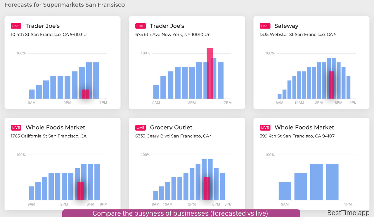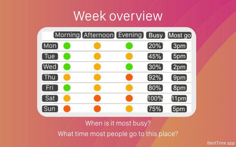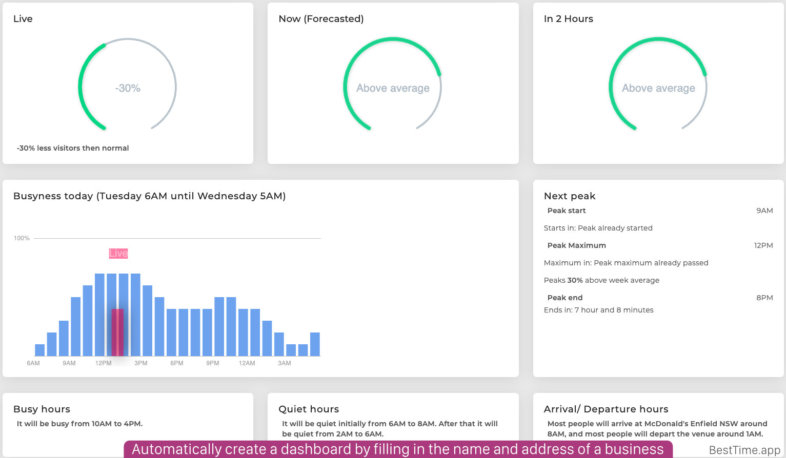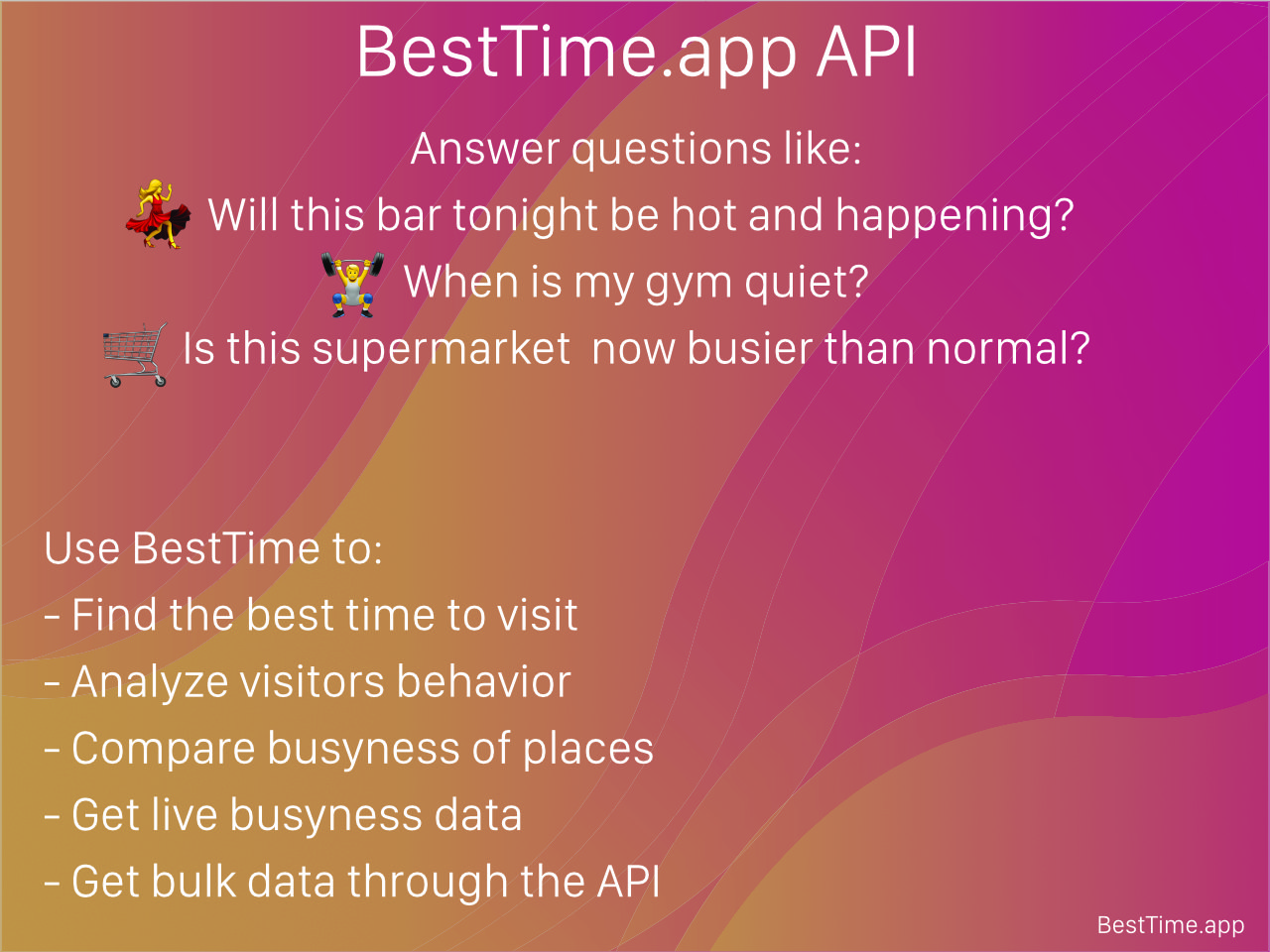 BestTime.app forecasts how busy public businesses will be. All you have to do is type the name and address of the public business. For each public business BestTime will try to forecast: - how busy it will be per hour - how busy it is now (live) - list of the visitor peaks per day - list of all busy hours - list of all quiet hours - at what time most people go and leave - a week overview - Dynamic data like (time remaining until next peak, or quiet hour) - All data will be available through the Developers API - create a dashboard overview with all analyses Register for free to create a detailed dashboard for your favorite venue. Use the 'compare venues' demo without registration to compare the busyness of all your favorite places You could use the tool to find popular bars for tonight, or see which supermarket and gym in your neighborhood is the quietest. Who else could use this? - Marketing researchers - Websites with curated lists of bars (e.g. Best bars in New York City) Please let me know if you have any feedback or (partnership) ideas for tools I can build on top of this API.