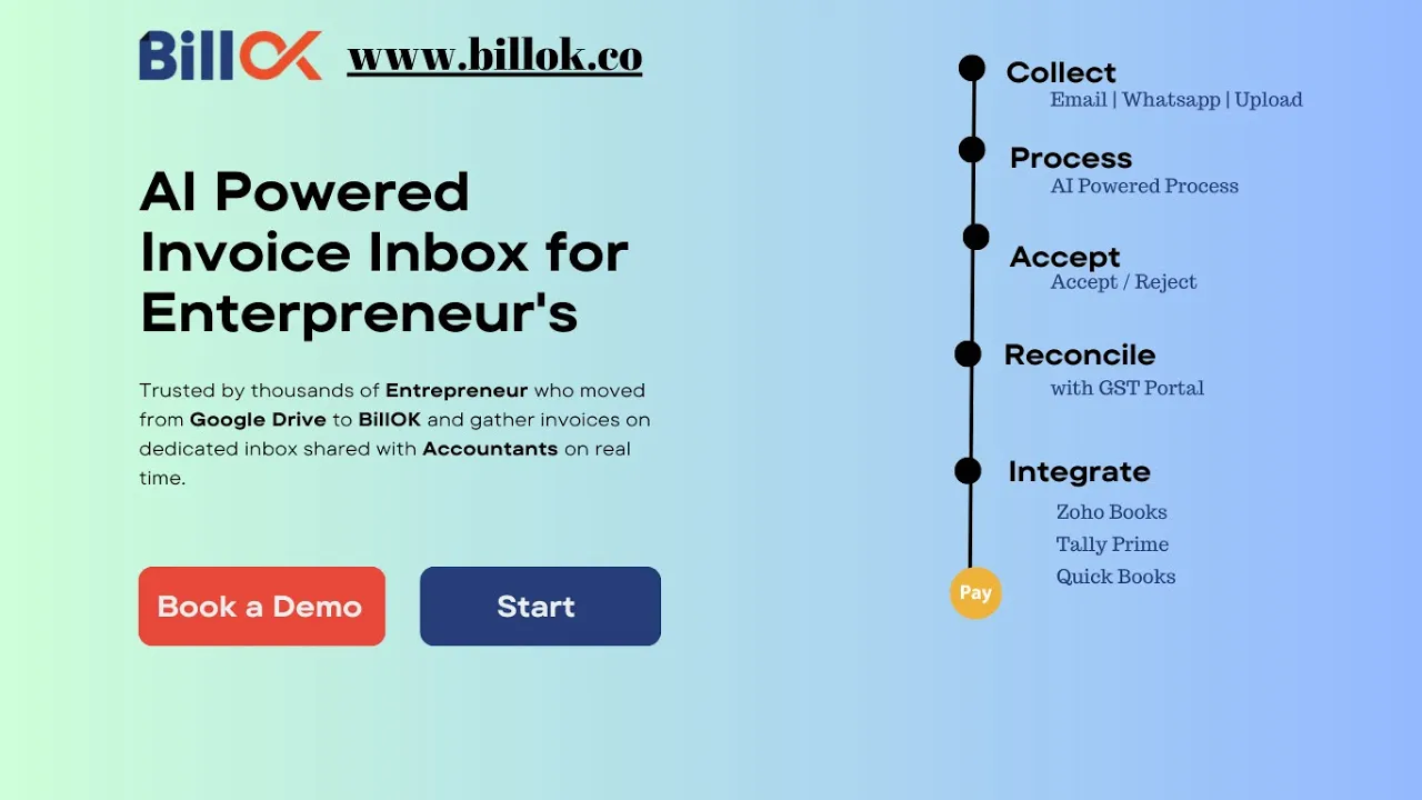 Bill OK, AI Powered Invoice Inbox is for Founders and Accountants. Just put your vendor invoice on automate flow with our dedicated email address for organization, Whatsapp forward number and manual upload. Collect Invoices, Auto Process with help of AI, Pay on click from one place.