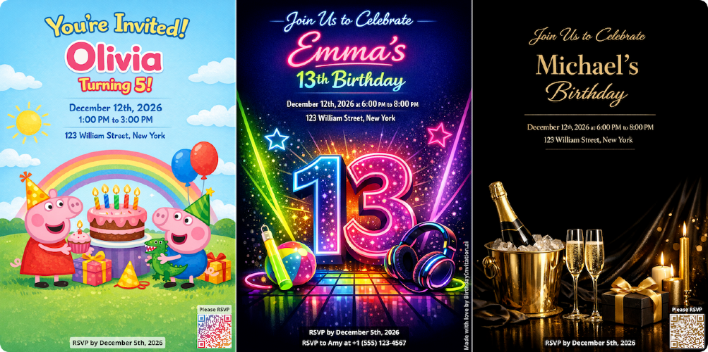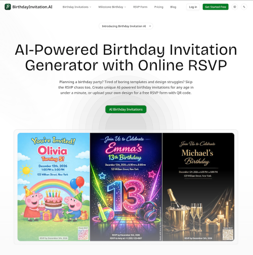 Birthday Invitation AI is an all-in-one platform for creating beautiful birthday invitations and managing RSVPs. Generate personalized, print-ready invitations using AI in under a minute—no design skills needed. Describe any theme in any language, and our AI will create a custom design for kids (ages 1-12), teens (ages 13-19), and adults (20+). We also offer specialized templates for milestone birthdays (1st, 2nd, 10th, 13th, Sweet 16, 18th, 21st, 30th, 40th, 50th, 60th, 70th, 80th, 90th). Every invitation includes a unique QR code that guests can scan to RSVP instantly from their phone—no apps or accounts required. Track RSVPs in real time, manage guest counts, dietary restrictions, and messages, all organized automatically. Already have your own invitation design? Upload it and get a completely free RSVP form with QR code—no signup fees or subscriptions required. The platform also sends automatic email reminders to registered guests before the party. Available in 8 languages (English, Spanish, French, German, Portuguese, Italian, Dutch, Russian), making it perfect for international families.