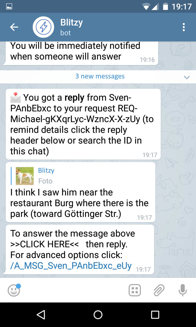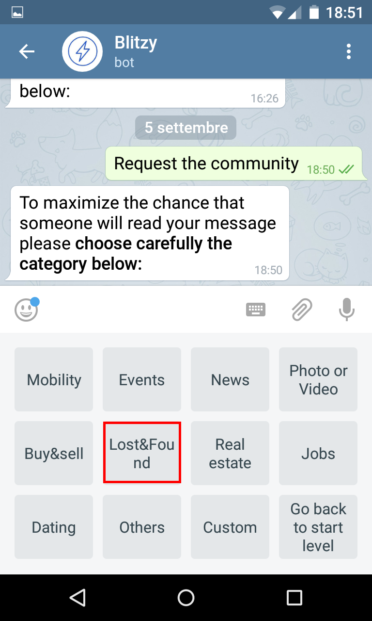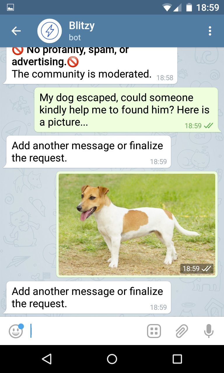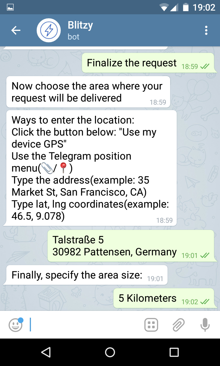 Blitzy is a platform that matches its users basing on where they are located and on what they need or offer. For detailed information go the web page, here are just some of the features: - Blitzy is a Telegram chatbot. The conversational interface is super easy, users can exchange any kind of content - No need to go through the installation process, it takes just few seconds to start Blitzy for the first time. - Safe for privacy, runs in a secure context (Telegram), doesn't read data from phone or sensors, you decide when/how update location, user data not exposed to other users. - Matching is based on location, distance and categories of interests. You can create your own platform using custom categories serving a large userbase separated from standard users - Built with cloud and microservices for optimal scale