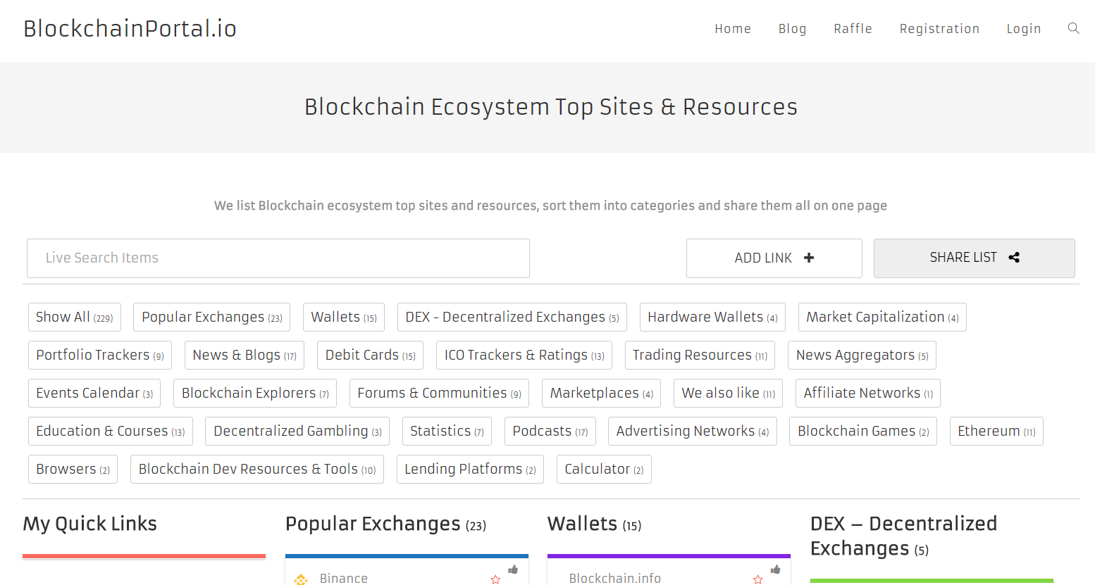 We list Blockchain ecosystem top sites and resources, sort them into categories and share them all on one page. No intrusive ads. No affiliate links. No paid listings.
